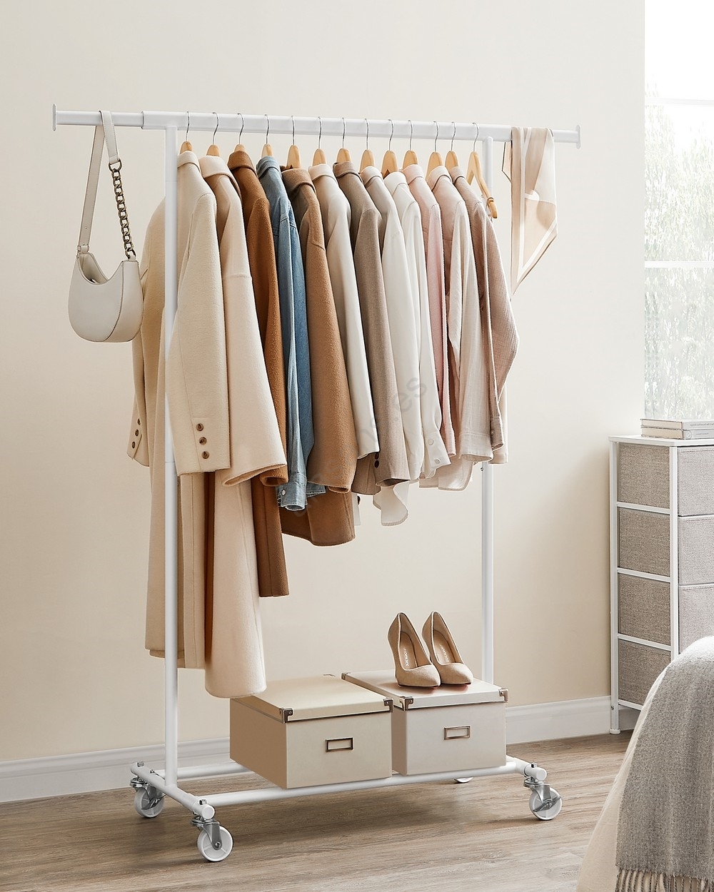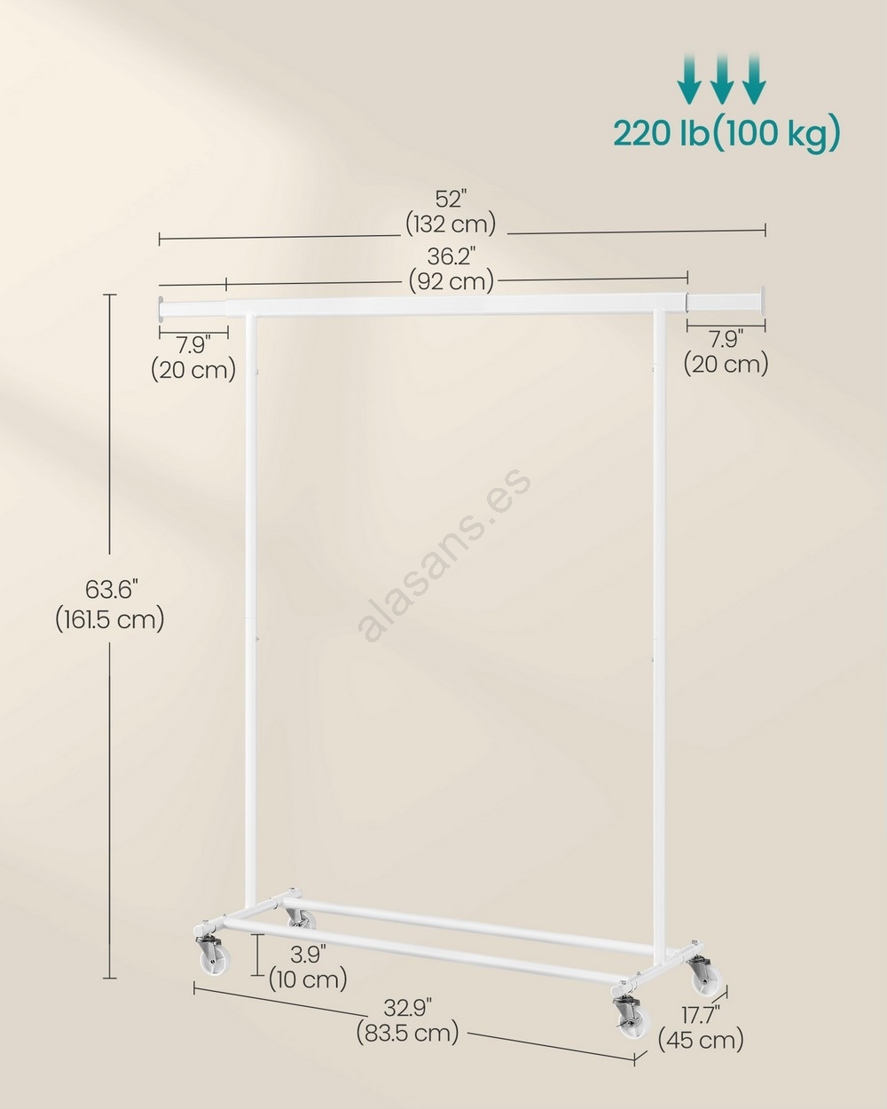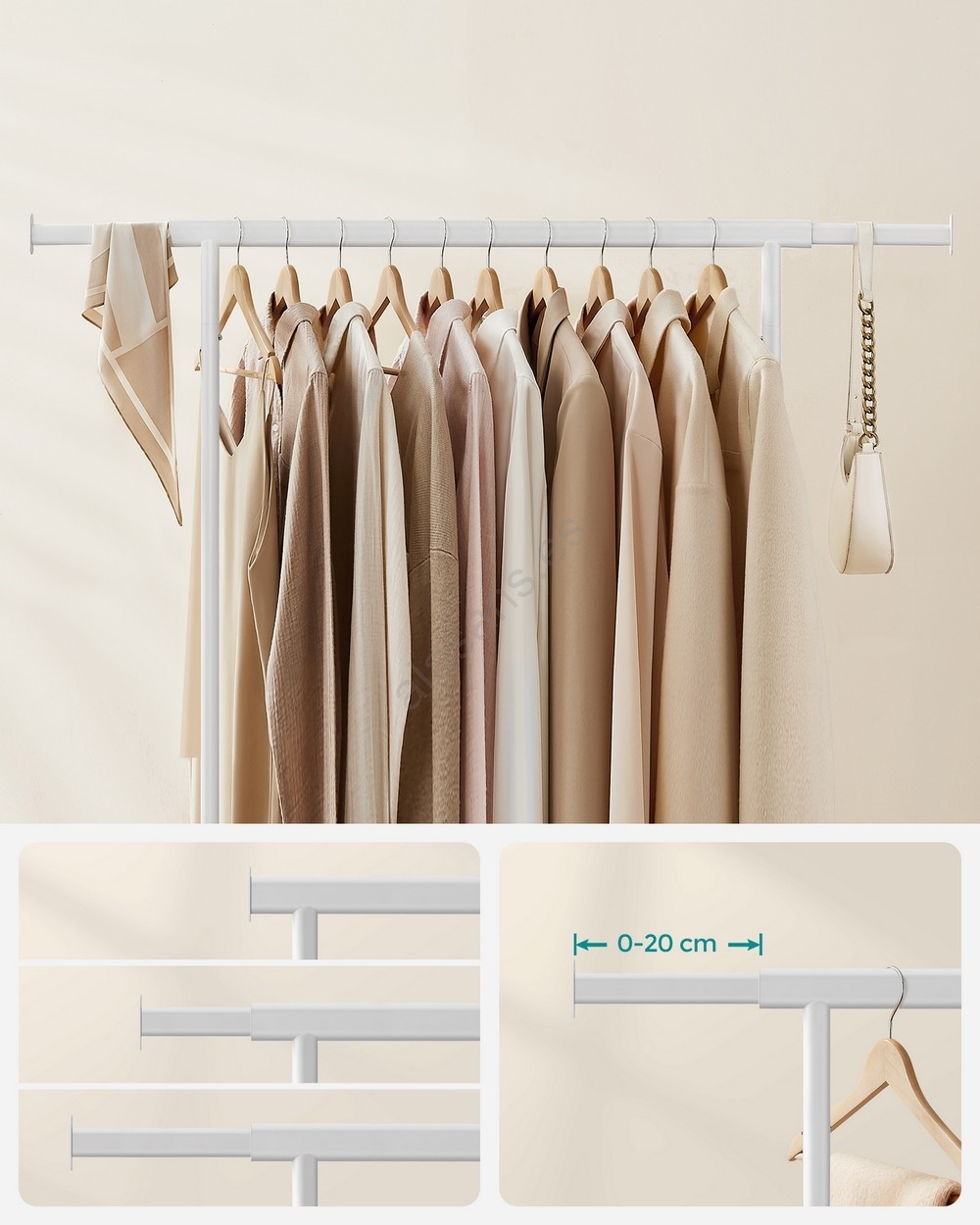 • La barra superior soporta hasta 100 kg (con carga distribuida uniformemente) sin balanceo ni vuelco; la barra extensible ofrece espacio adicional para su ropa, sombreros, bolsos, etc.