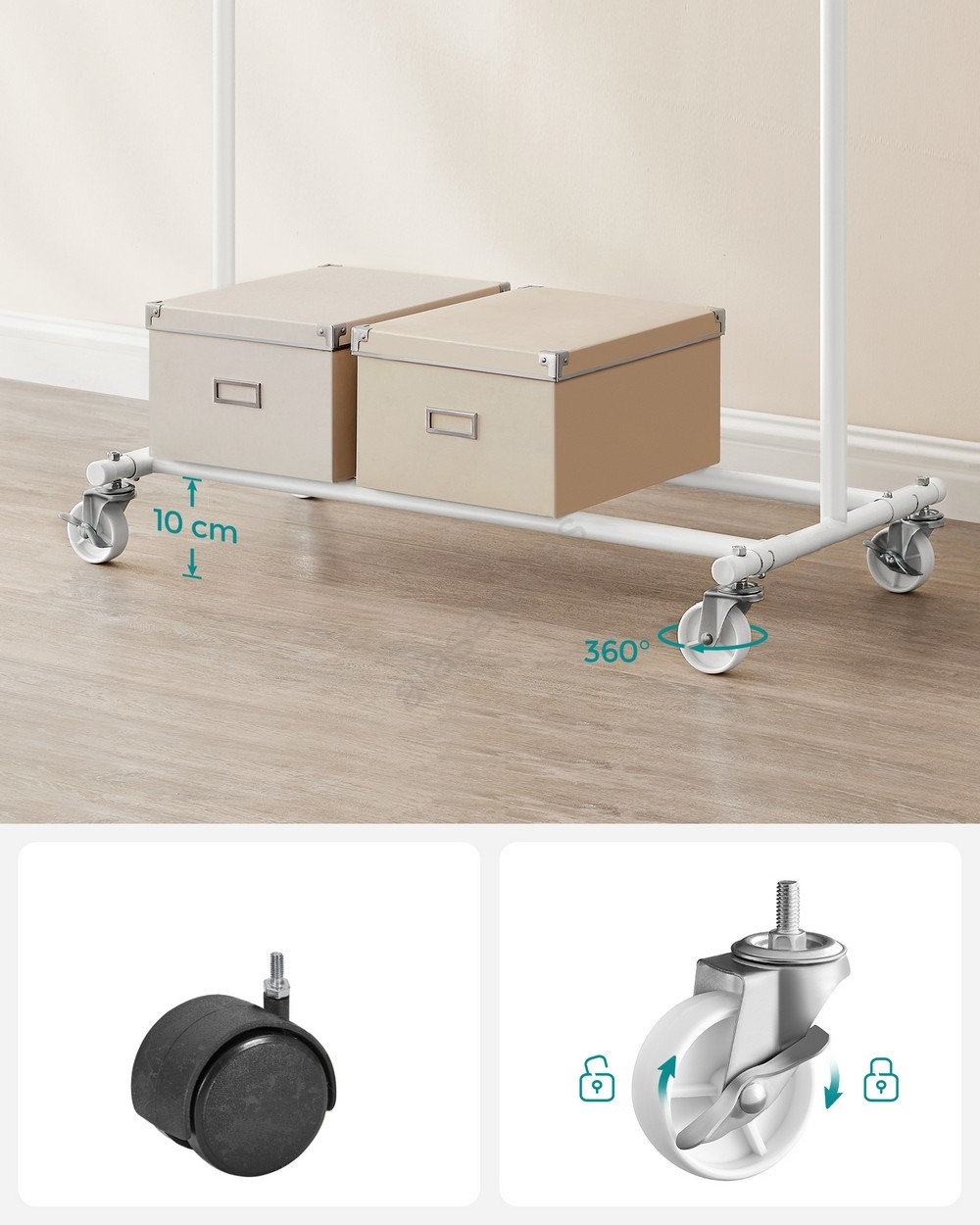 • 4 ruedas robustas giratorias de PP de 360 grados (2 con freno) facilitan su traslado o mantener el perchero inmóvil.