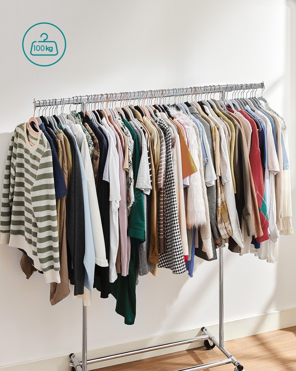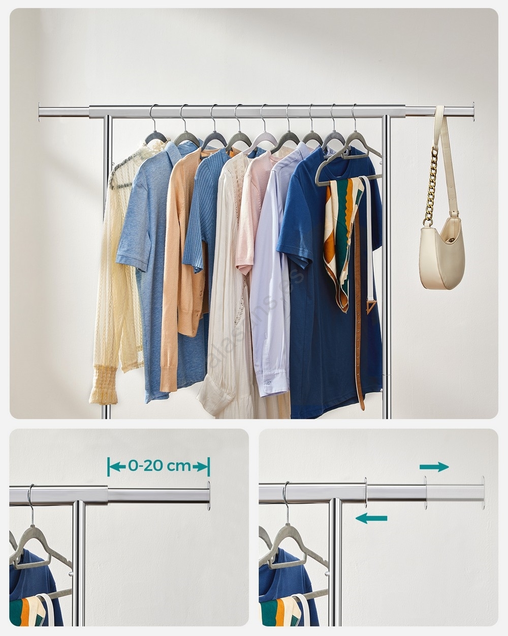 • La barra superior soporta hasta 90 kg (con carga distribuida uniformemente) sin tambalearse ni volcarse; la barra extensible ofrece espacio adicional para tu ropa, sombreros, bolsos, etc.