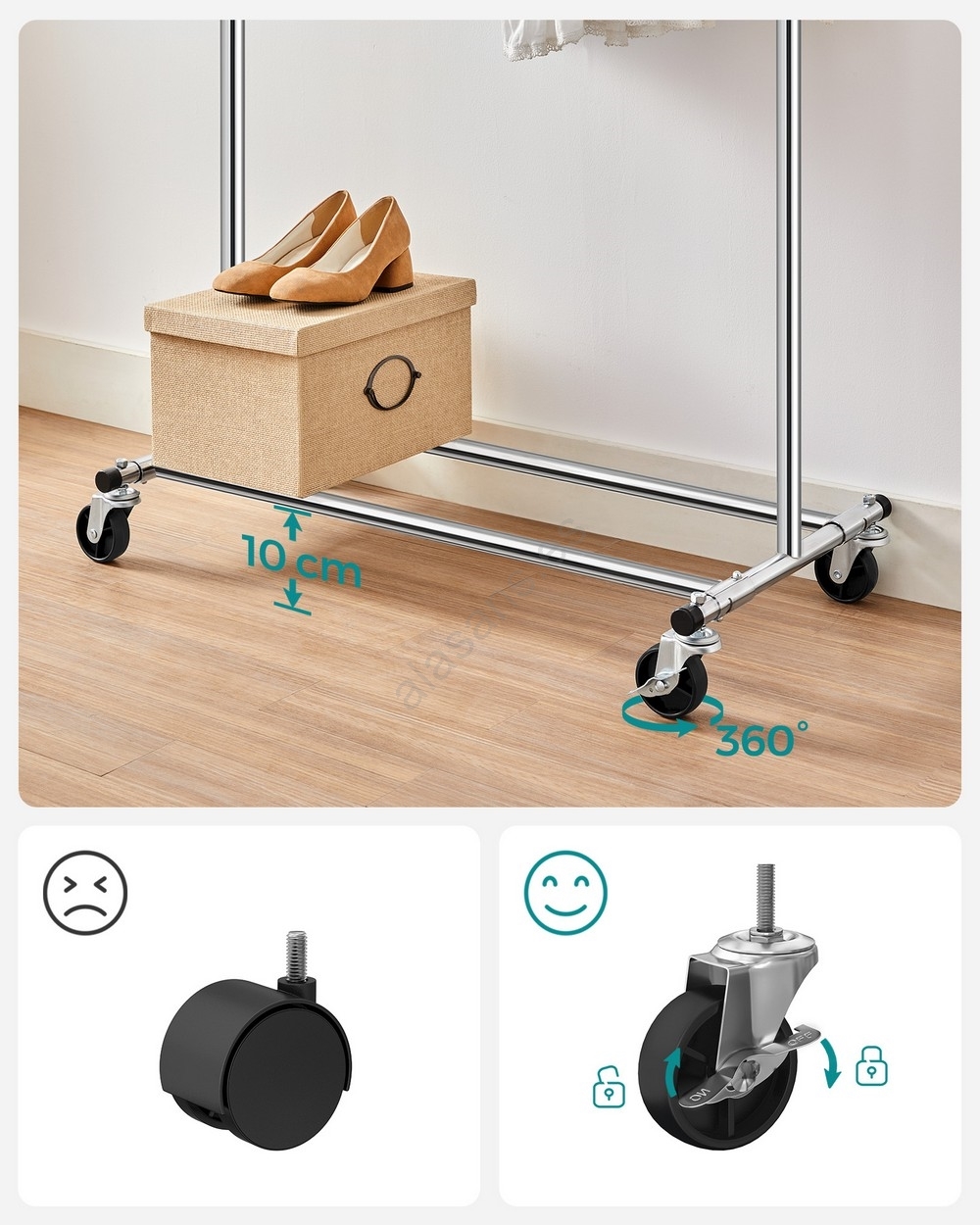 • 4 ruedas giratorias de PP resistentes con rotación de 360° (2 con freno) facilitan moverlo o dejar el perchero inmóvil.