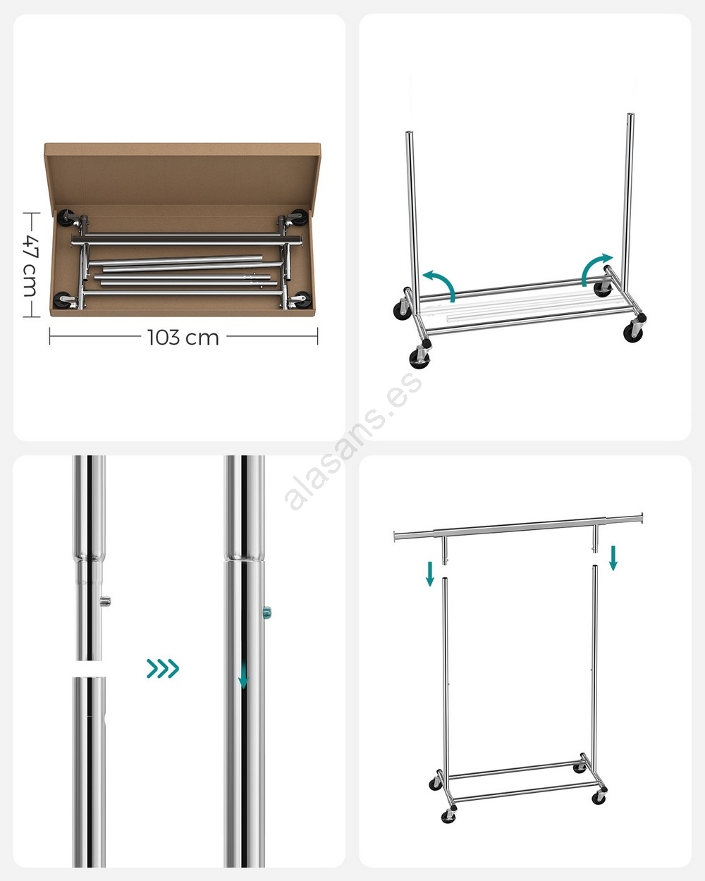 • Se suministra con 2 barras inferiores para tus cajas de almacenaje, por lo que es funcional tanto en el dormitorio o vestidor para guardar artículos de uso diario, como en la lavandería para secar la ropa.