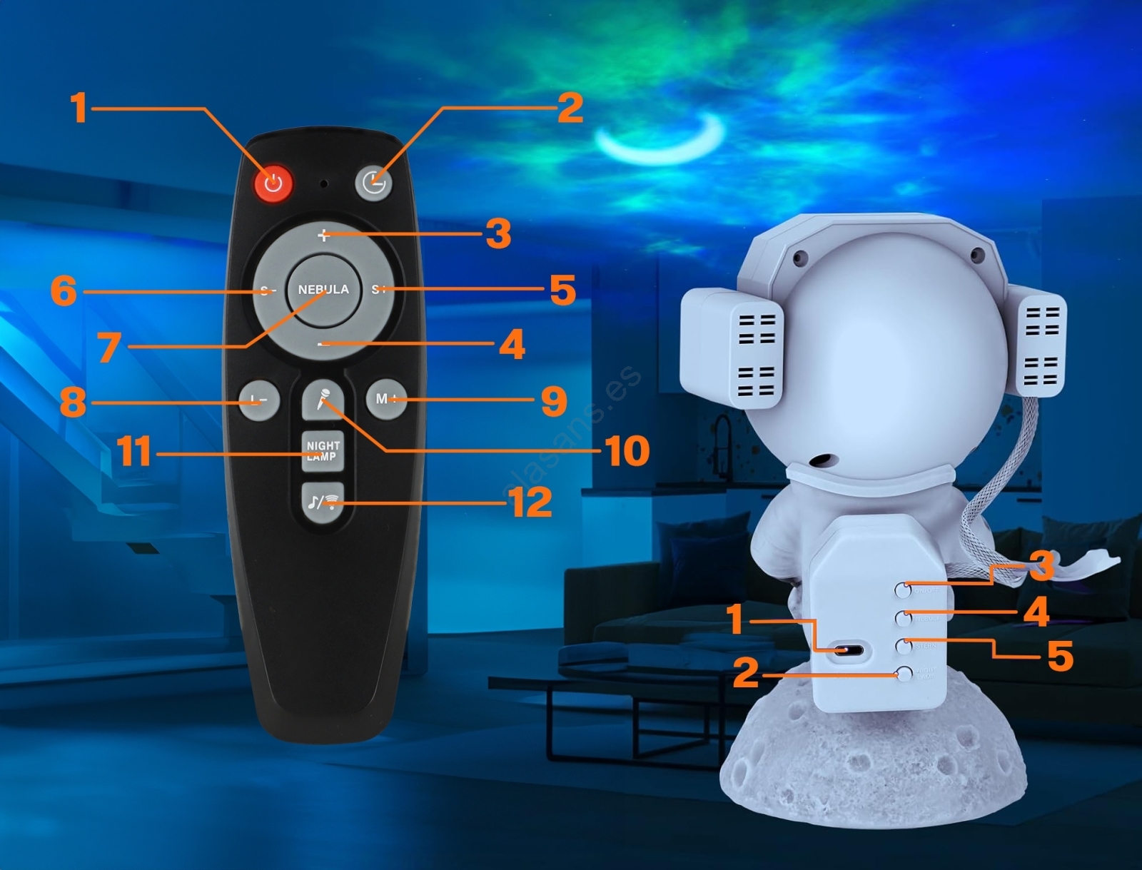 • Luz nocturna 3 en 1: proyector, altavoz y lámpara de noche.
