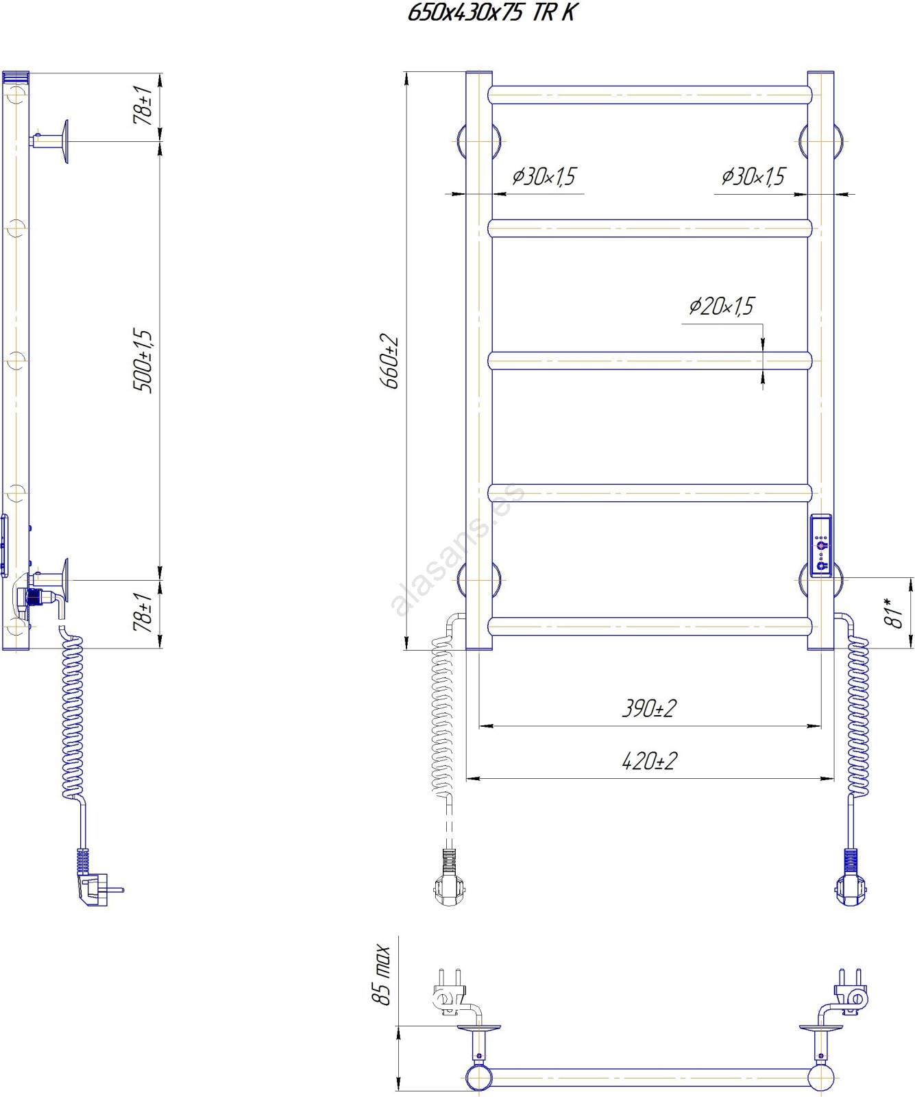 Radiador toallero tipo escalera para baño CLASSIC 65W/230V 66x42 cm acero inoxidable/negro versión derecha