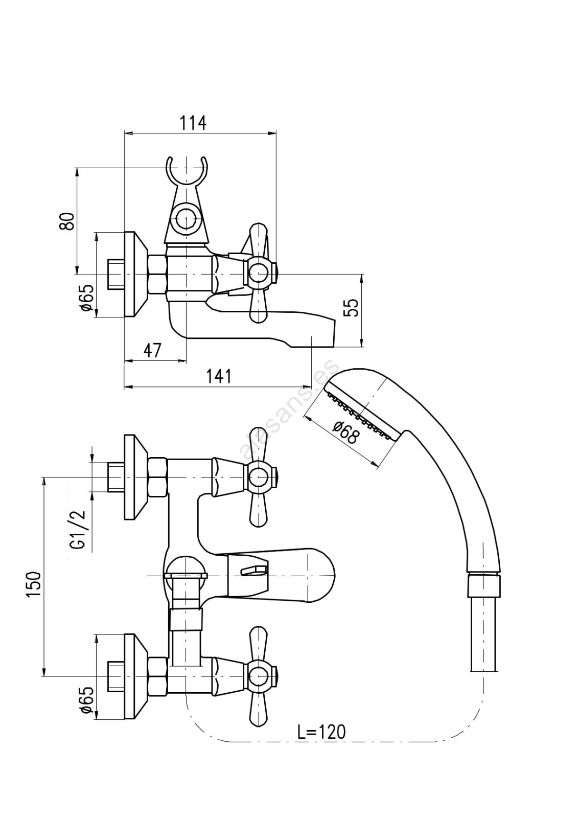 • Set para bañera con grifo mural para bañera con desviador cerámico, soporte tipo horquilla para la alcachofa y alcachofa de ducha.