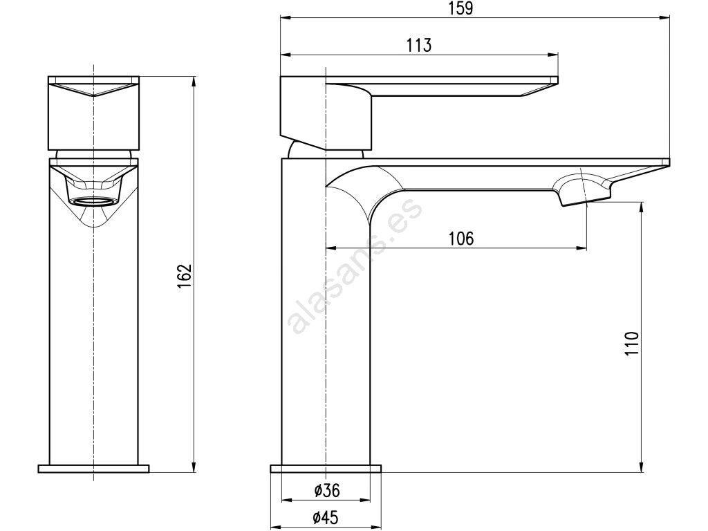 • Grifo monomando de lavabo de montaje en encimera sin válvula de desagüe.
