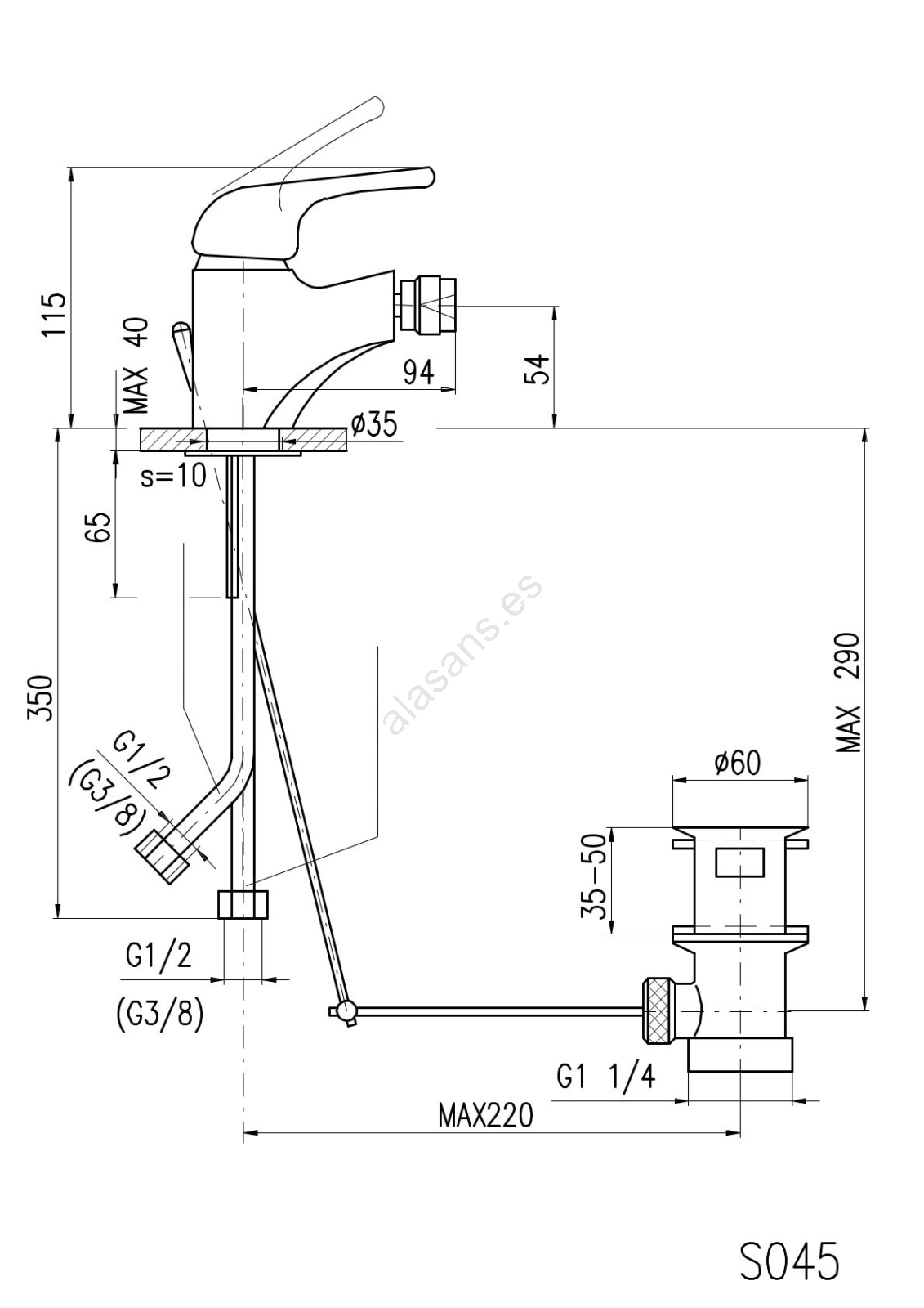 • Grifo monomando para bidé de sobremesa con desagüe de 60 mm de diámetro.