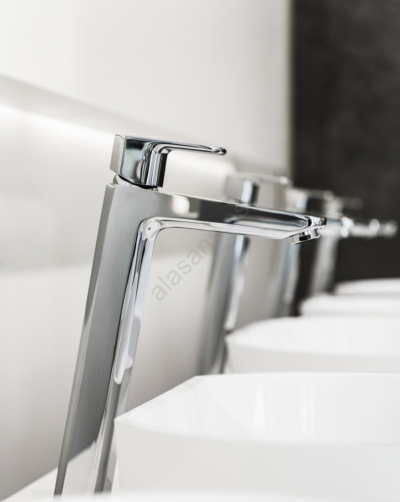 • El grifo de lavabo Free en acabado cromado brillante presenta una altura extra prolongada de 334 mm, ideal para lavabos sobre encimera.