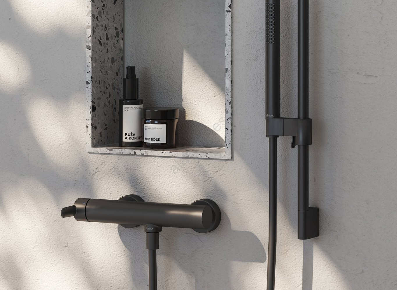 • El grifo mural de ducha Puri en acabado negro ofrece un aspecto elegante, alta calidad y un manejo cómodo de la temperatura.