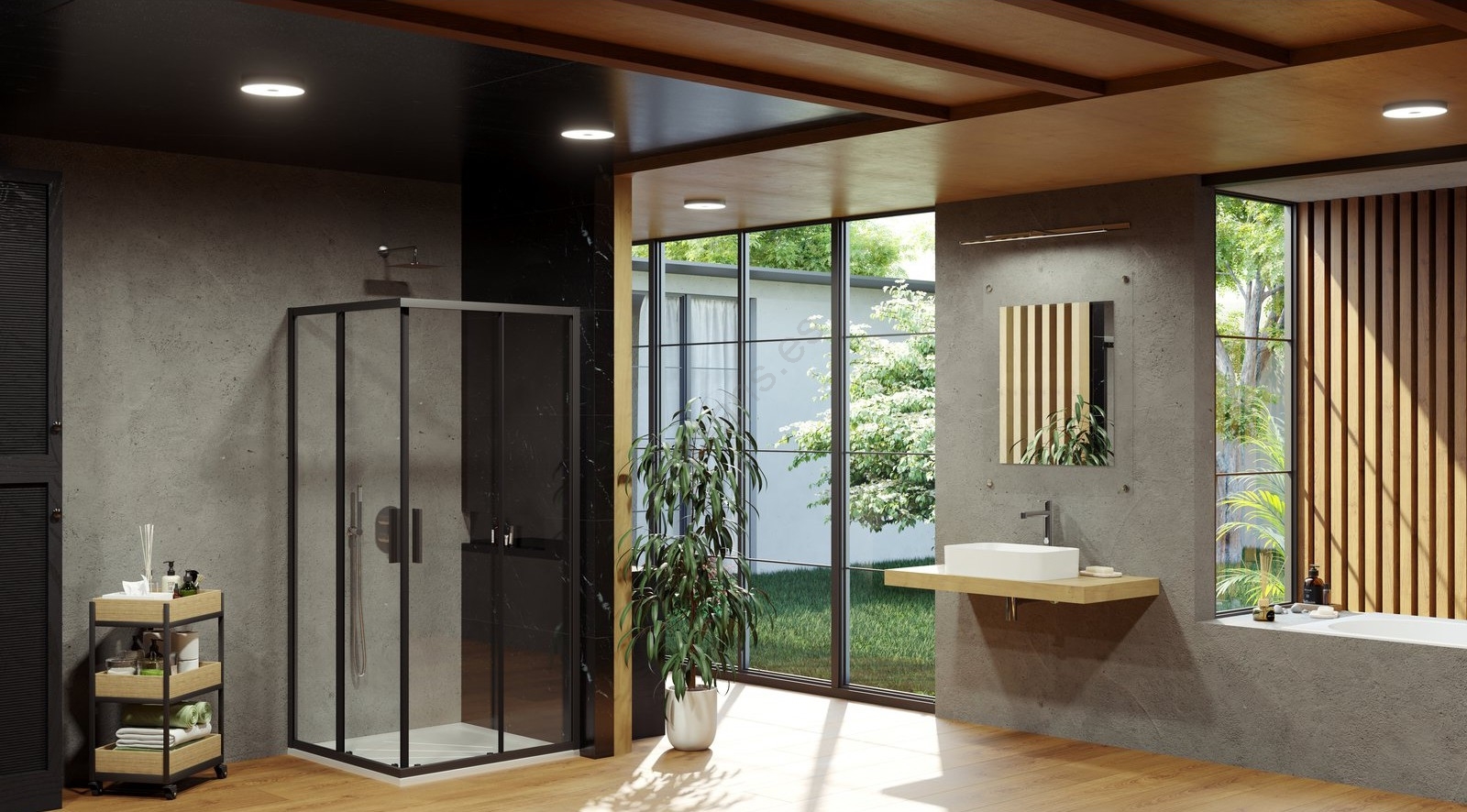 • La mampara de ducha de esquina Blix Slim de cuatro piezas en acabado negro ofrece una solución elegante y práctica para baños modernos.