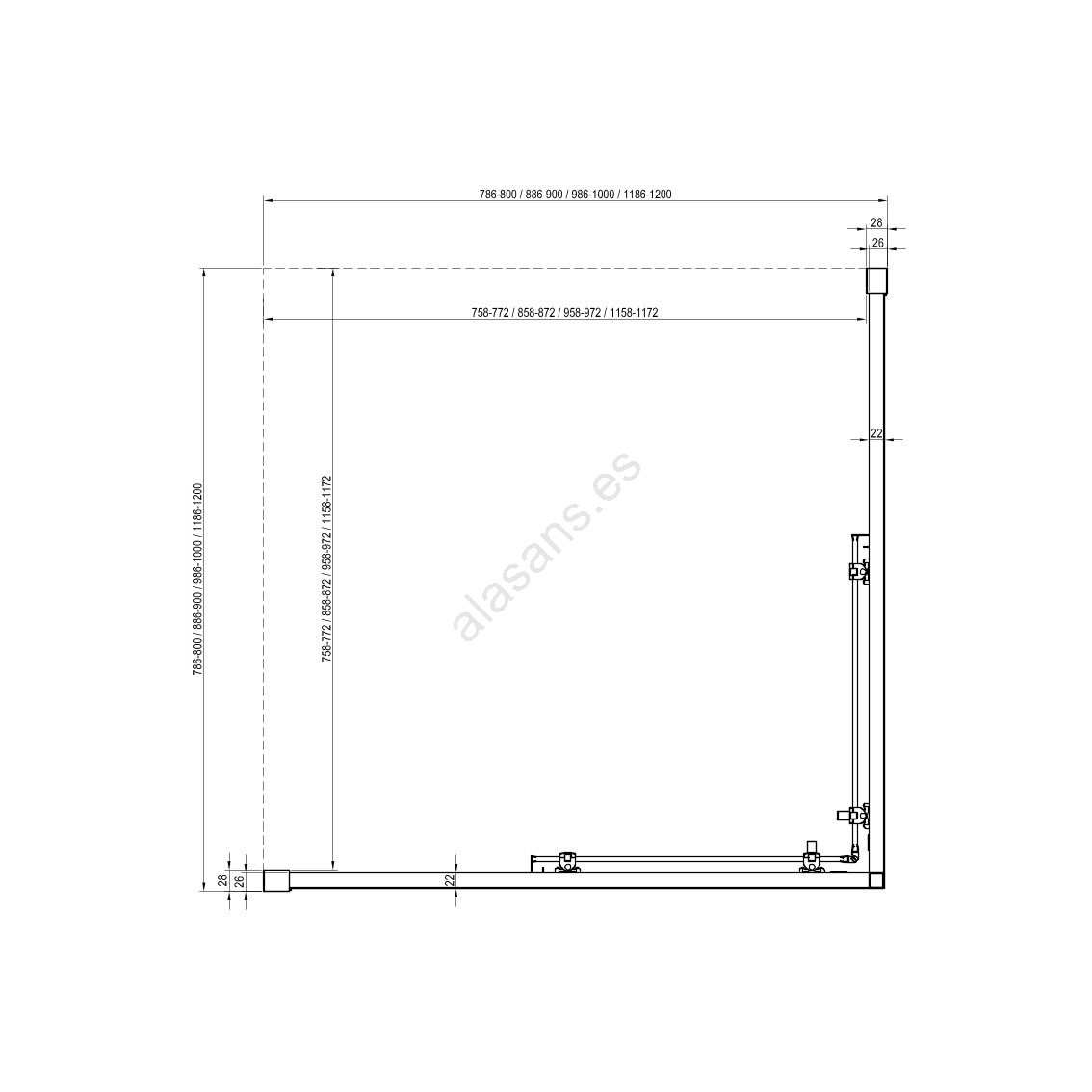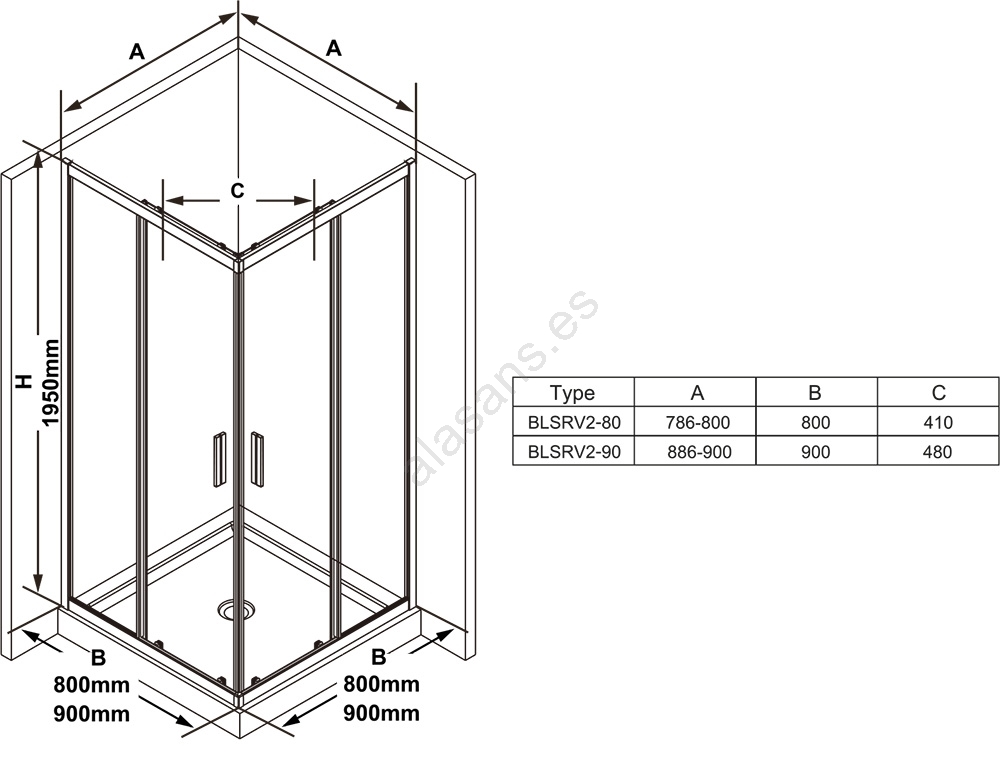 • La mampara, con una altura de 195 cm, está equipada con un sistema de apertura corredera compuesto por dos paneles fijos y dos paneles correderos.