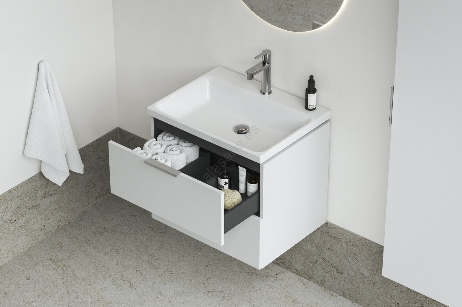 • El acabado en blanco ofrece una estética limpia y atemporal, adaptándose a cualquier estilo de baño.