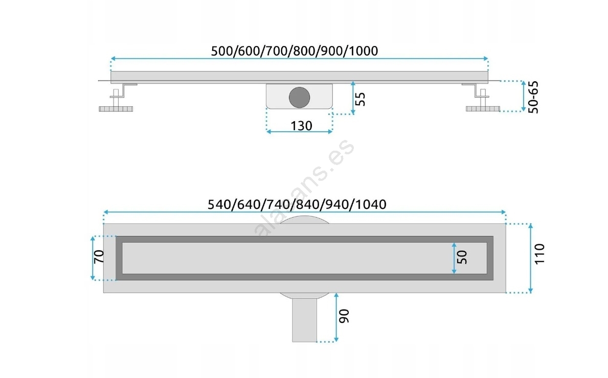 • Gracias a las patas regulables en altura (50–65 mm), el desagüe se adapta fácilmente a diferentes condiciones del suelo.