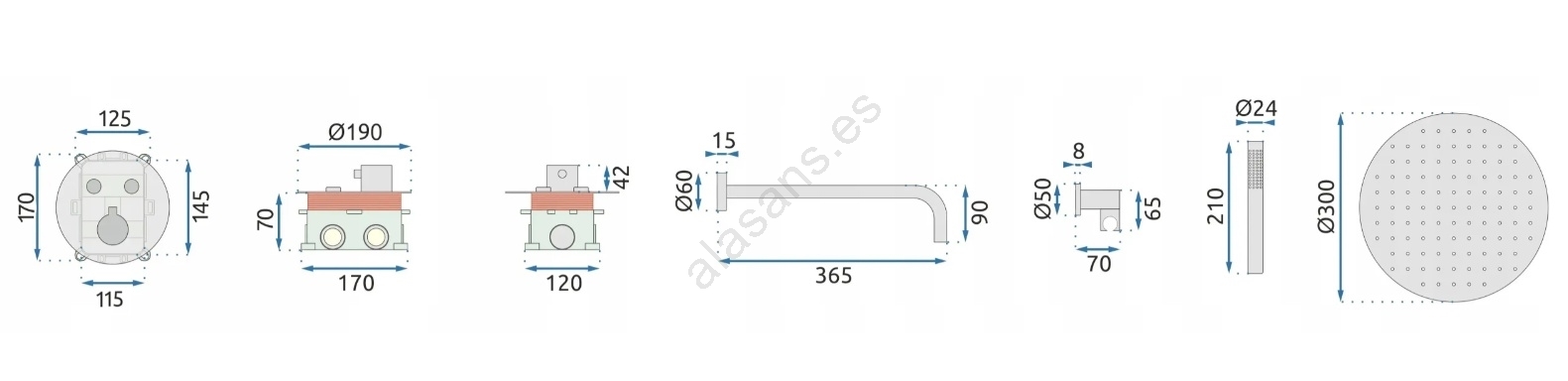 • El paquete incluye: caja empotrada, grifería completa, brazo, ducha de mano y cabezal de ducha, soporte para ducha de mano, manguera de 150 cm.
