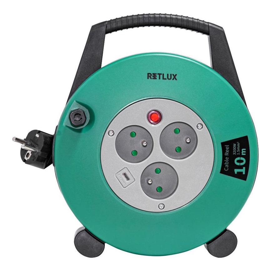 Retlux - Cable de extensión en tambor, 3 tomas, Tipo E, 10 m, verde/negro