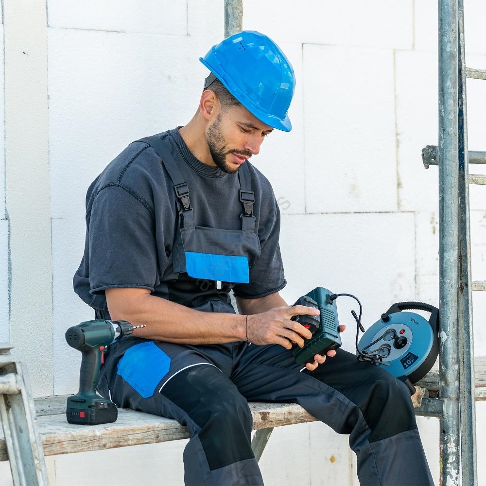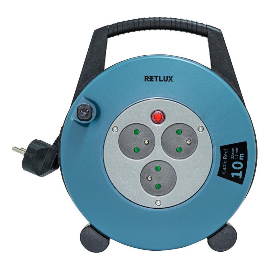 Retlux - Enrollador de cable de extensión, 3 tomas, Tipo E, 10 m, azul/negro
