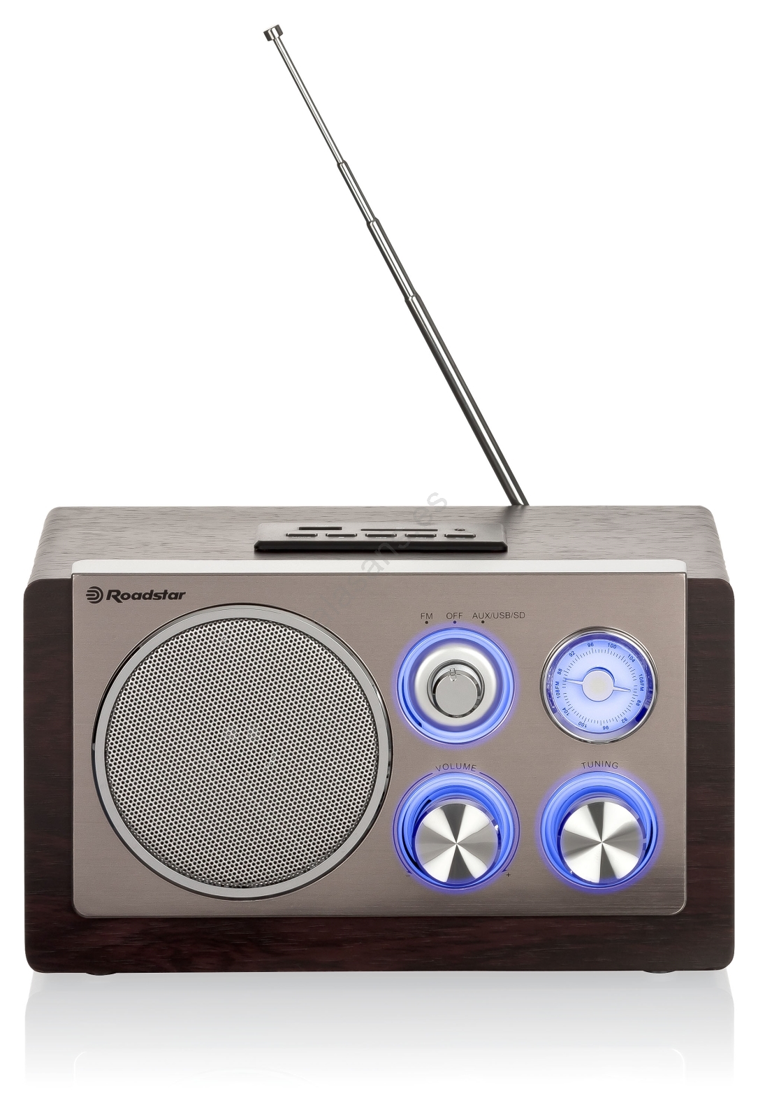• Sintonizador FM analógico con sintonización manual y escala retroiluminada en azul para una lectura clara y elegante.