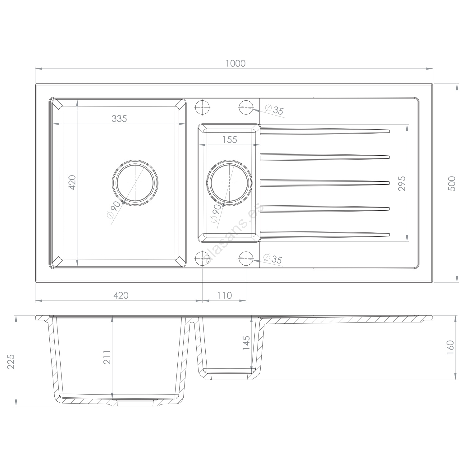 • Está diseñado para montaje superior e incluye válvula de desagüe con cesta y sifón.