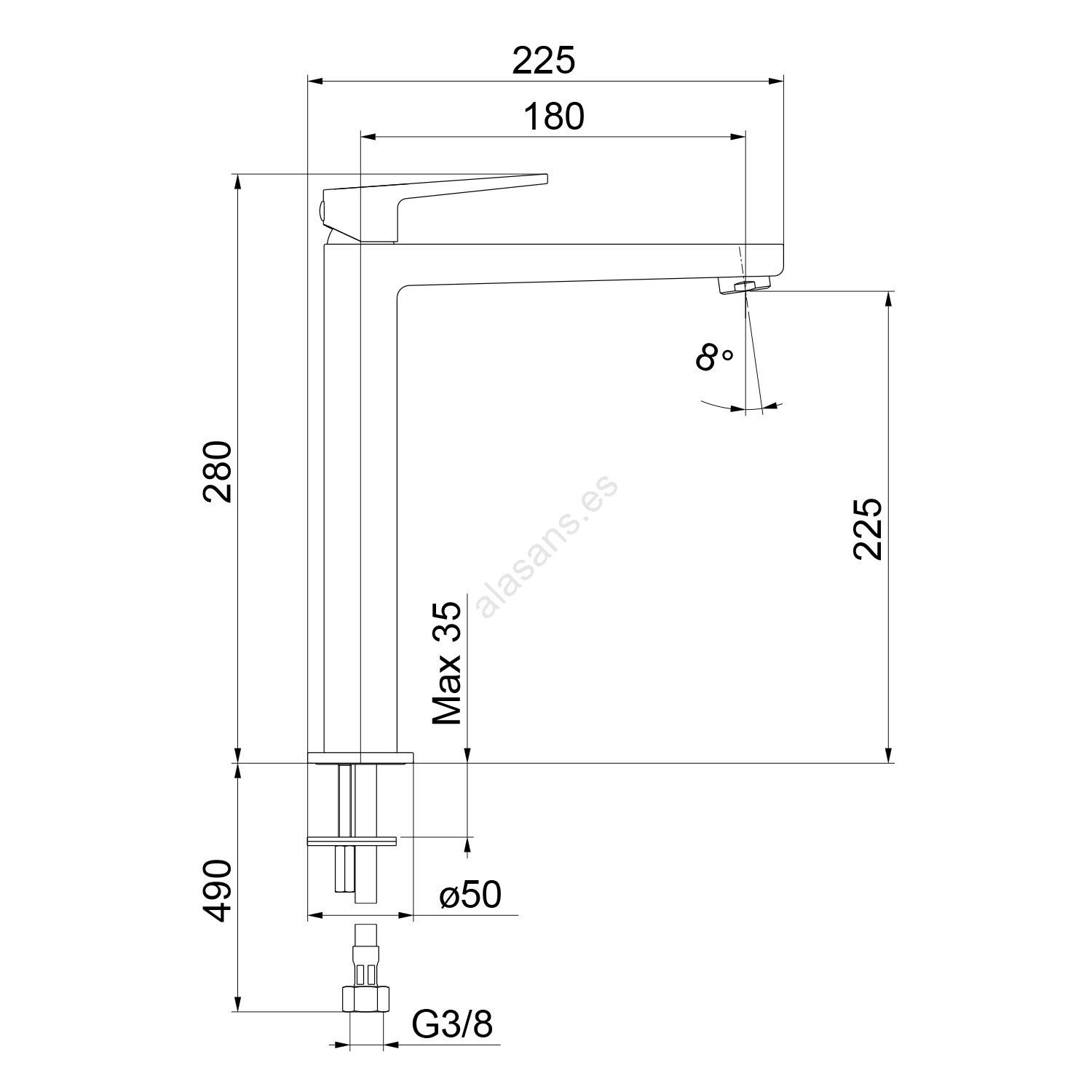 • La altura del caño es de 225 mm y su alcance es de 225 mm.