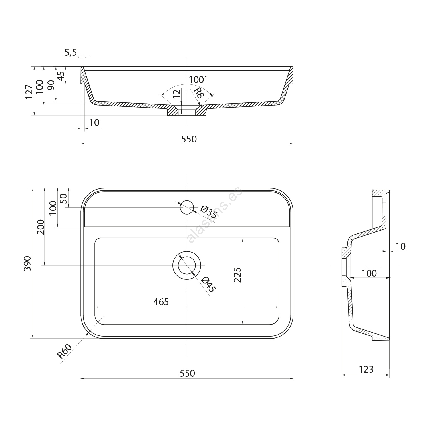 • Sus dimensiones son 550x390 mm y la altura es de 123 mm.