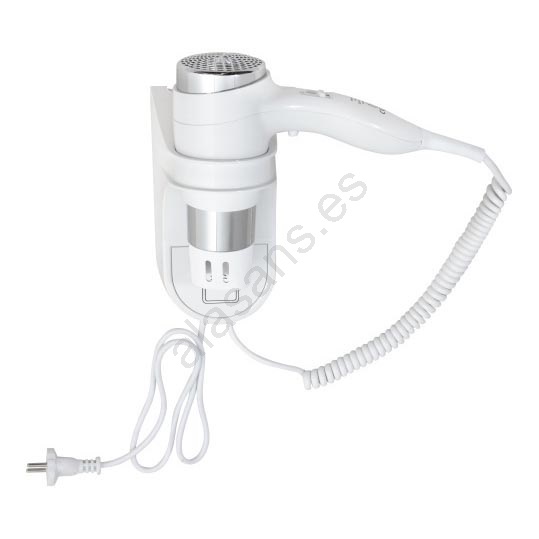 • Secador de pelo blanco elegante con soporte de pared para ahorrar espacio.
