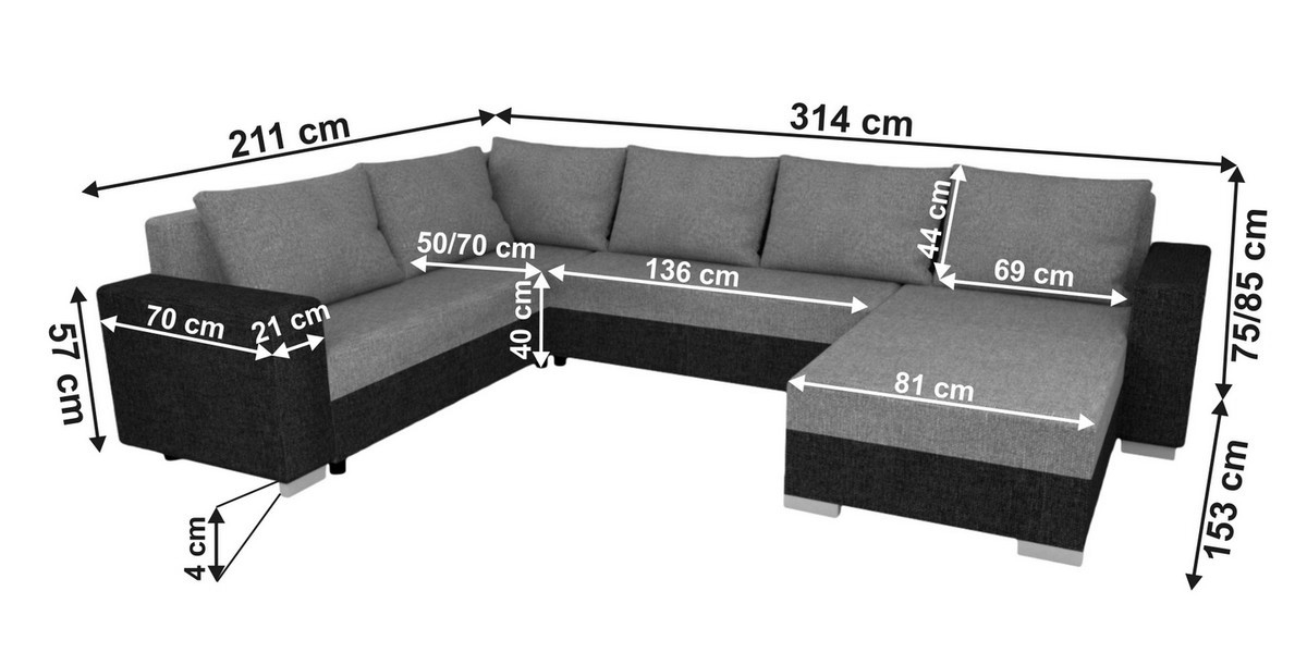 • Sofá cama tapizado en U YORK, reversible, gris/negro