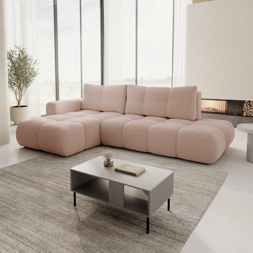 Sofá cama esquinero tapizado con arcón en L ALMADA, orientación izquierda, rosa