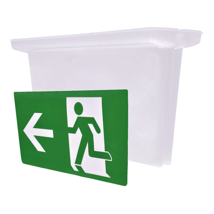 • Señal de techo para iluminación de emergencia, diseñada para señalizar las rutas de evacuación en espacios públicos o comerciales.