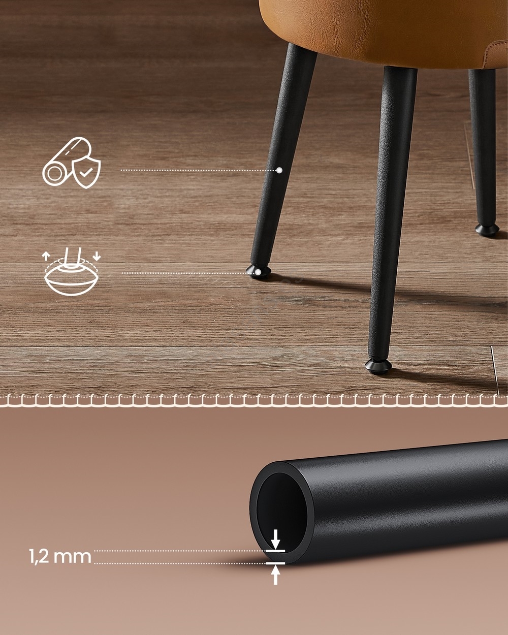 • Las elegantes patas de acero con pies articulados ajustables le confieren un aspecto moderno, soportan hasta 150 kg y garantizan estabilidad y larga durabilidad.