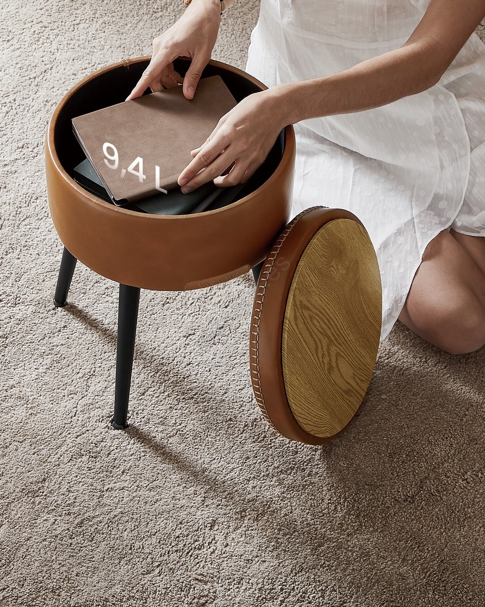 • En el interior del taburete hay espacio (9,4 l) para ocultar dispositivos electrónicos, libros, mantas y otros objetos.