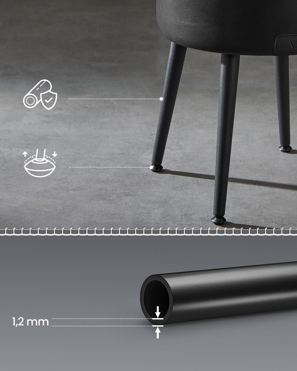 • Elegantes patas de acero con niveladores ajustables que proporcionan un aspecto moderno, soportan hasta 150 kg y garantizan estabilidad y larga durabilidad.