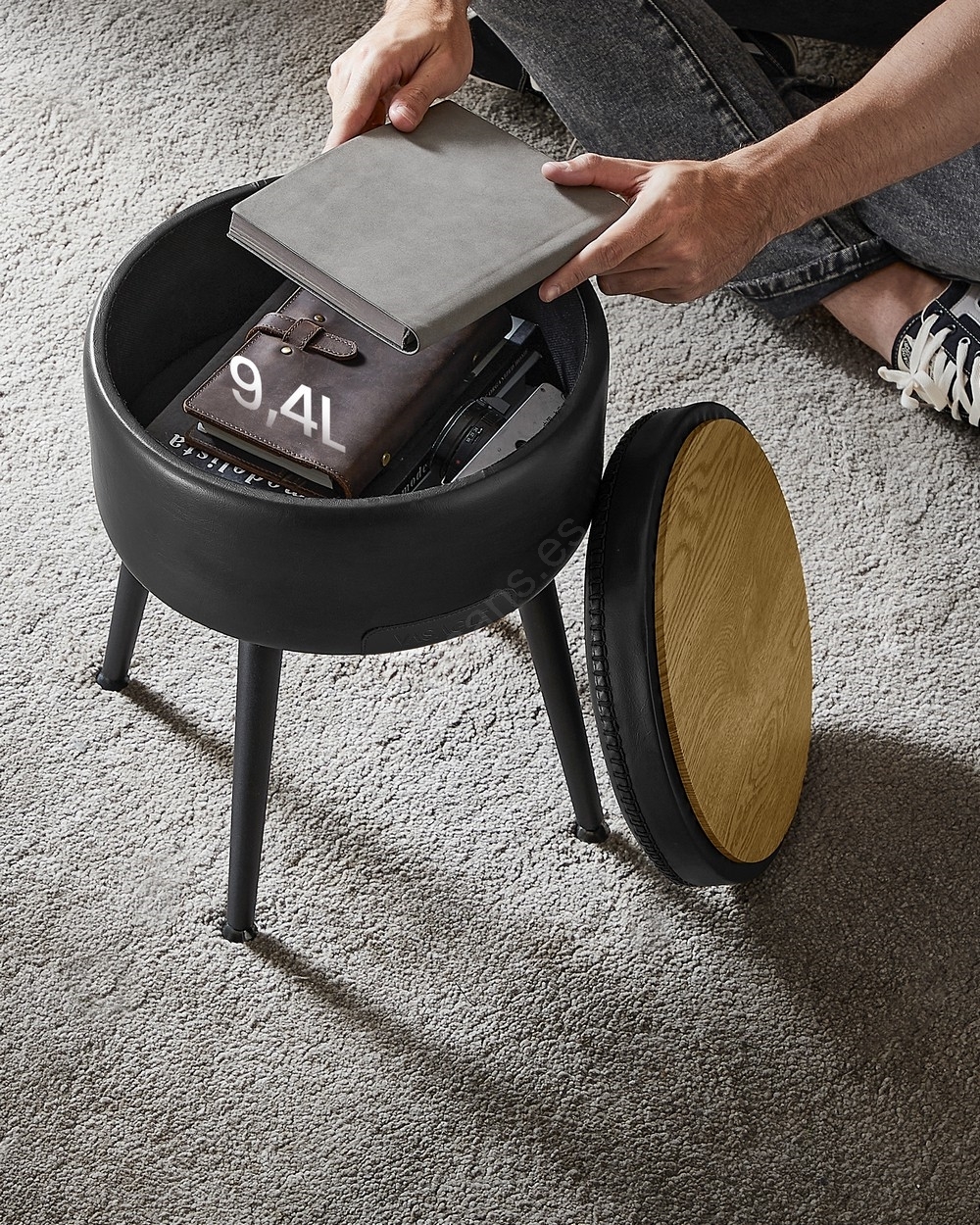 • En el interior del taburete hay un compartimento (9,4 l) para ocultar electrónica, libros, mantas y otros pequeños objetos.