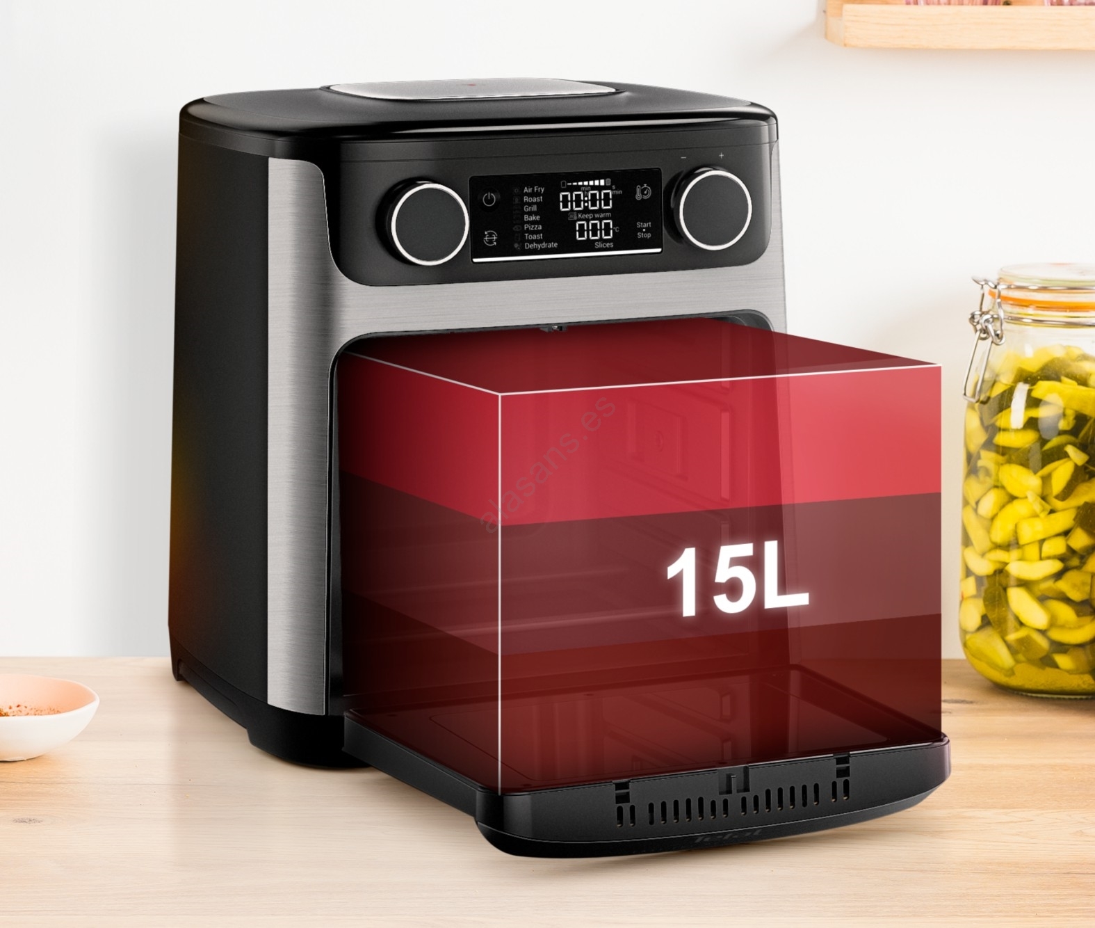 • Amplia capacidad de 15 litros con tres niveles de altura para cocinar varios platos a la vez.