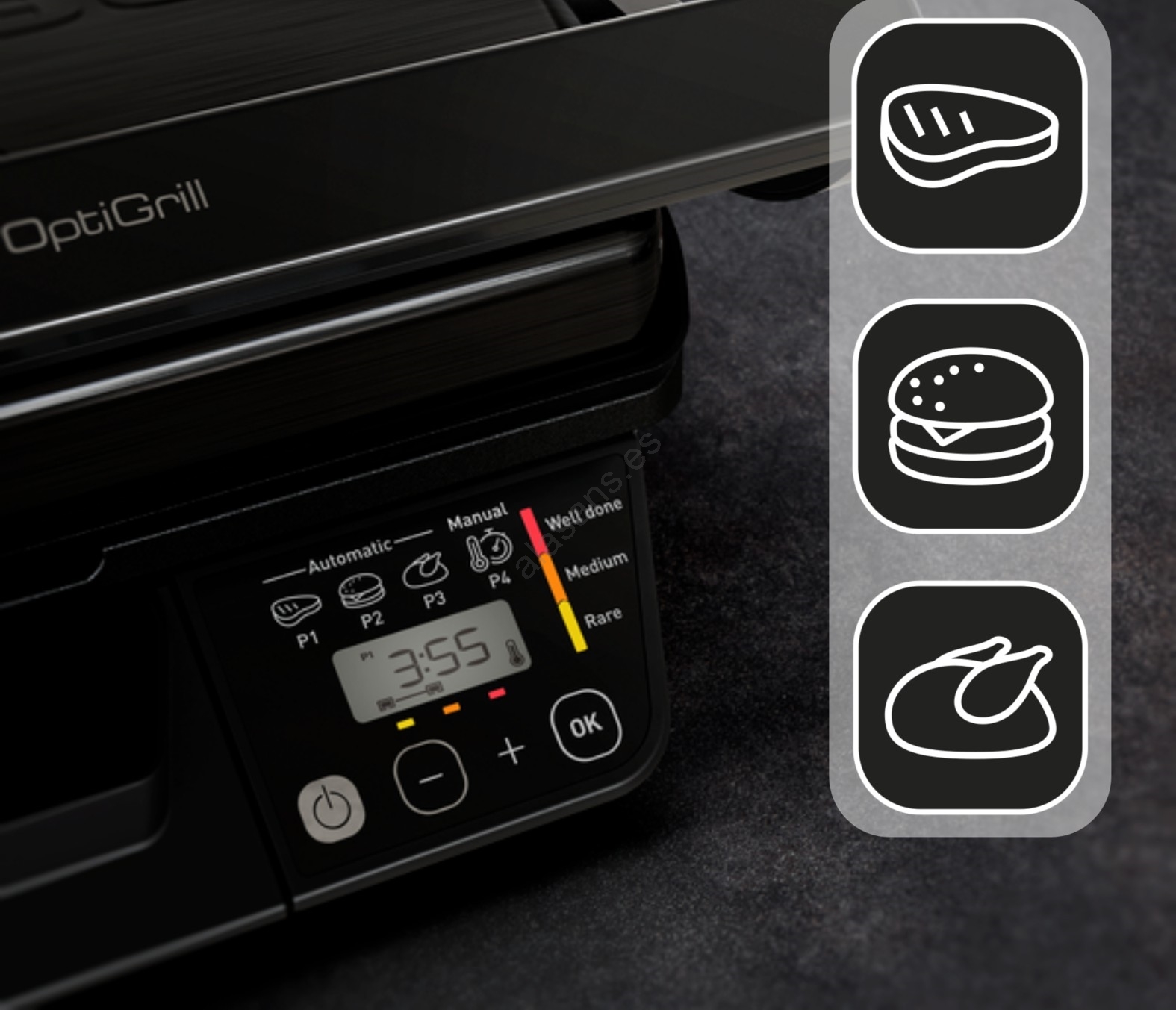 • Tres programas automáticos (carnes rojas, hamburguesas, aves) + modo manual para ajustar la temperatura y el tiempo a su gusto.