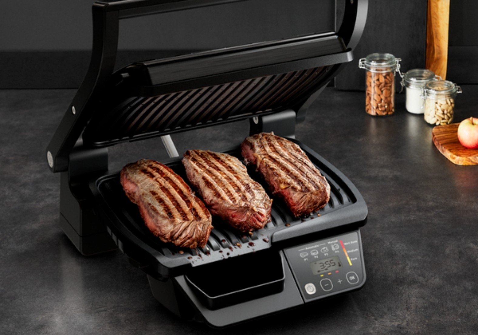 • Grill de contacto inteligente que mide automáticamente el grosor del alimento y ajusta el tiempo de cocción – para resultados perfectos, desde poco hecho hasta bien hecho.