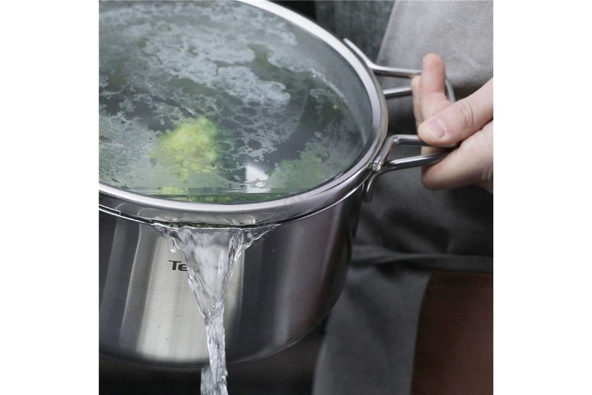 • Prácticos vertederos con pequeñas aberturas en cada pieza permiten escurrir directamente (p. ej., el agua de la pasta).