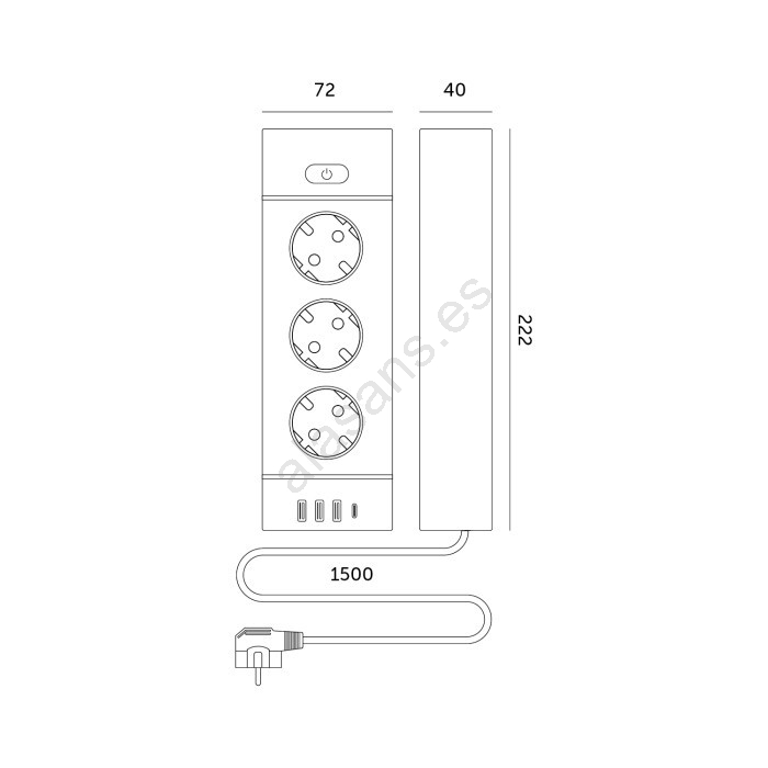 • Número de tomas: 3 x 230 V, 3 x USB-A y 1 x USB-C.