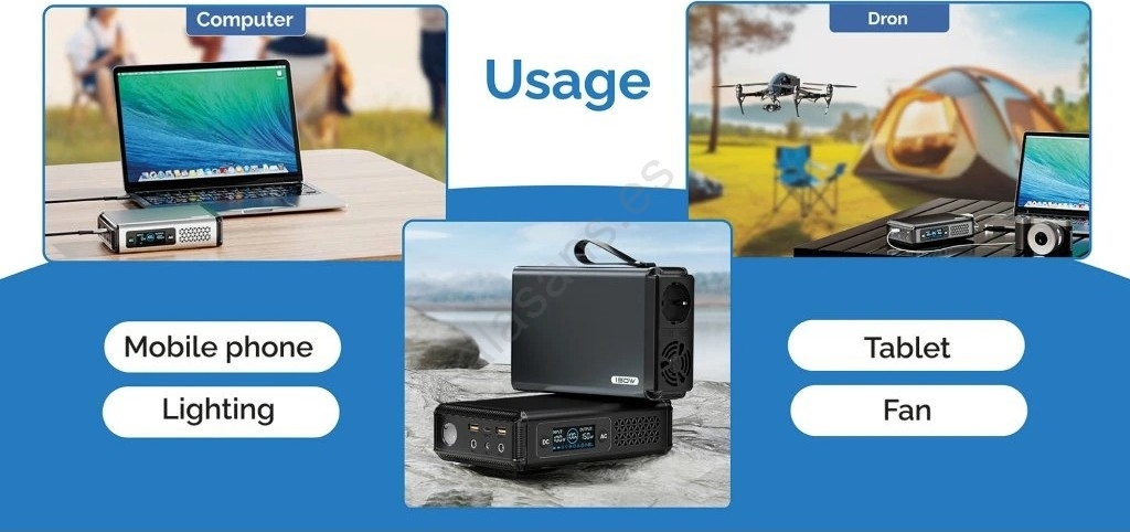 • Generador portátil de batería, compacto y potente, equipado con seis salidas diferentes, lo que lo convierte en una herramienta versátil para alimentar una amplia gama de dispositivos.