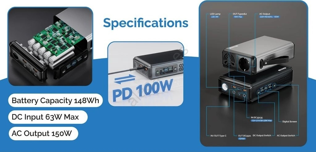 • Contenido del paquete: adaptador de corriente, cable PD bidireccional de 100W, enchufe tipo F (Schuko).