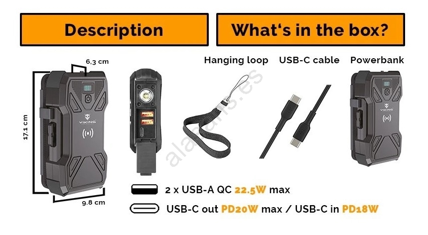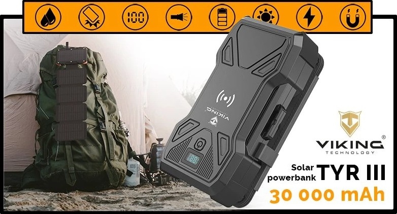 Viking - Power bank con linterna LED, carga inalámbrica y panel solar Power Delivery 22,5W/30000 mAh