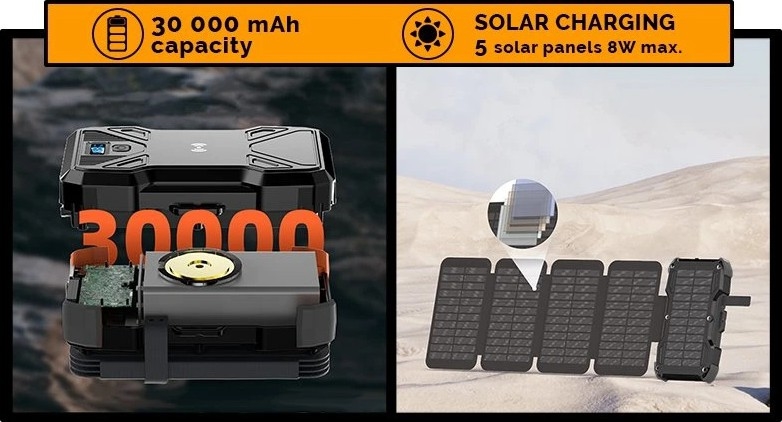 • Batería externa con capacidad de 30000 mAh, función de carga solar e inalámbrica y linterna LED integrada.