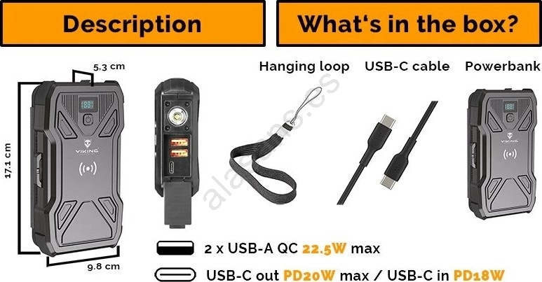 Viking - batería externa con linterna LED, carga inalámbrica y panel solar, Power Delivery 22,5 W / 20.000 mAh