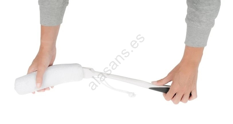 • La esponja con mango curvo Vitility es un accesorio ergonómico diseñado para facilitar el lavado y la aplicación de gel de ducha en zonas de difícil acceso, especialmente la espalda y las piernas.