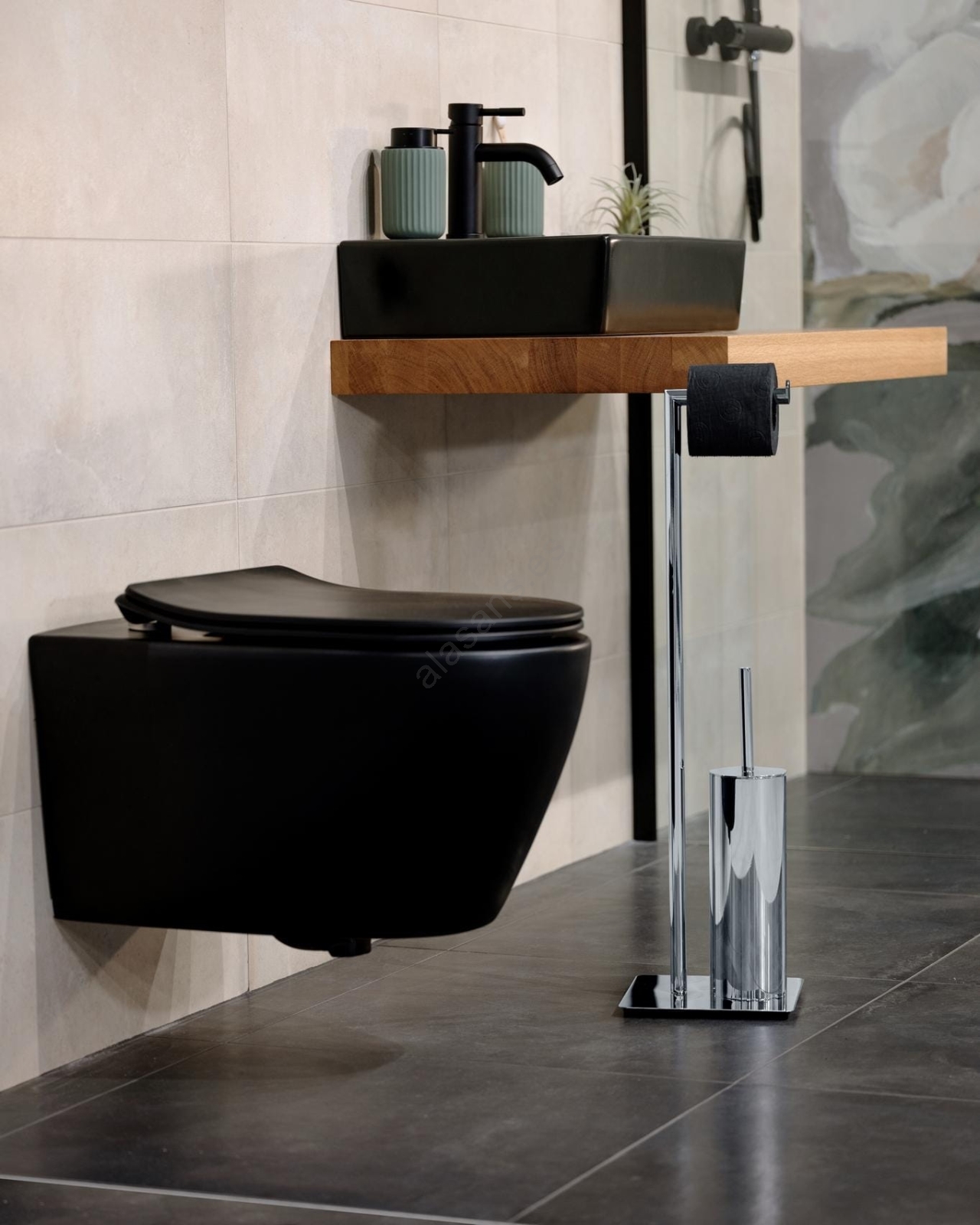 • Combinación de un soporte cerrado para el cepillo de WC y un portarrollos de papel higiénico.