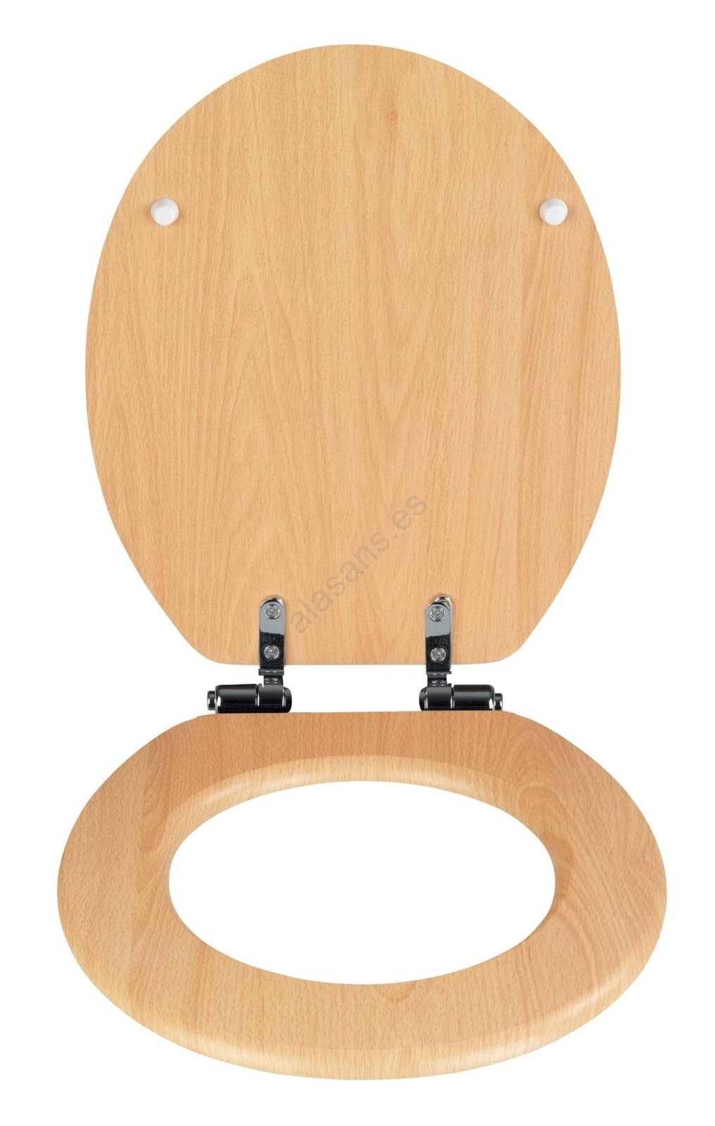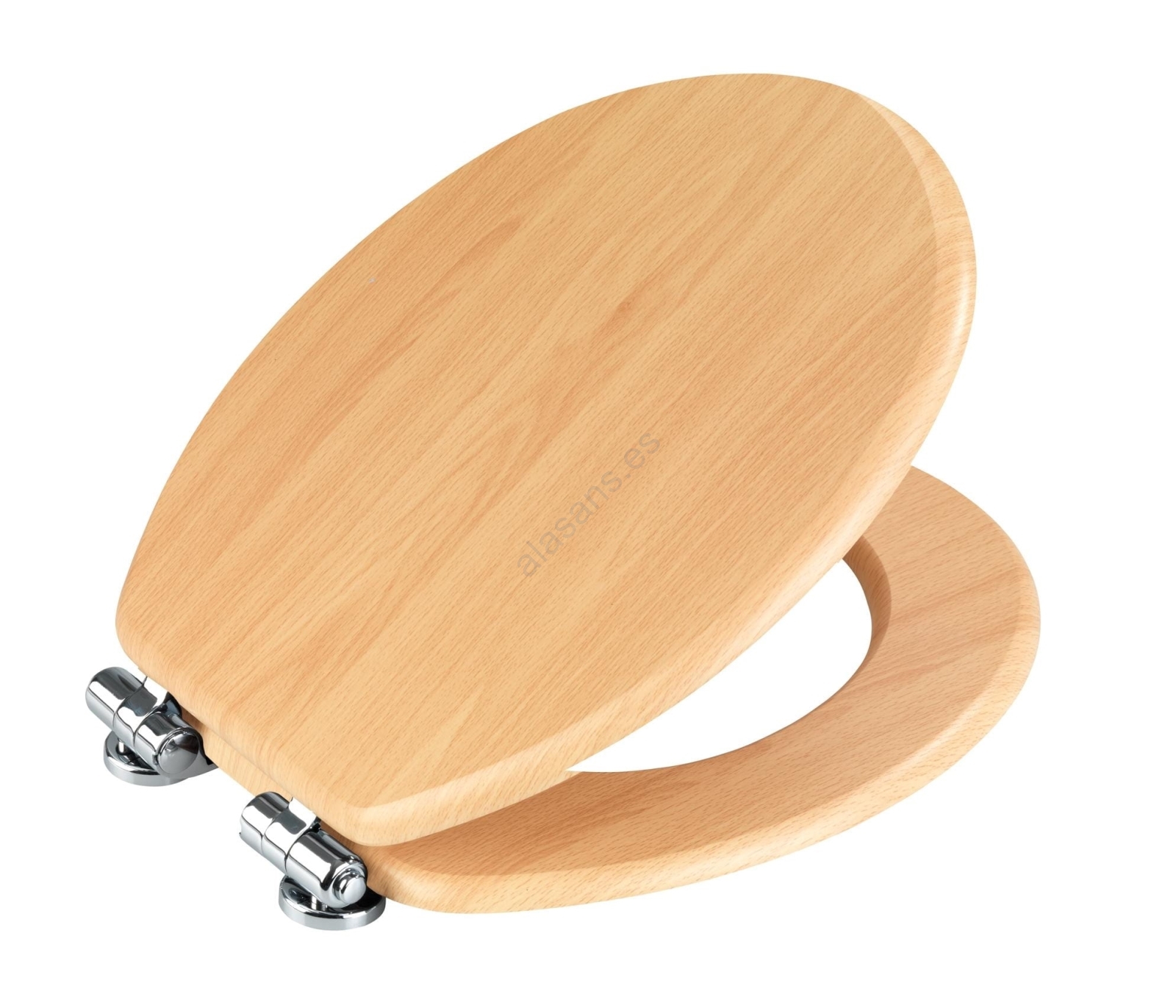 • Asiento de inodoro elegante con acabado en haya natural, ideal para baños modernos.
