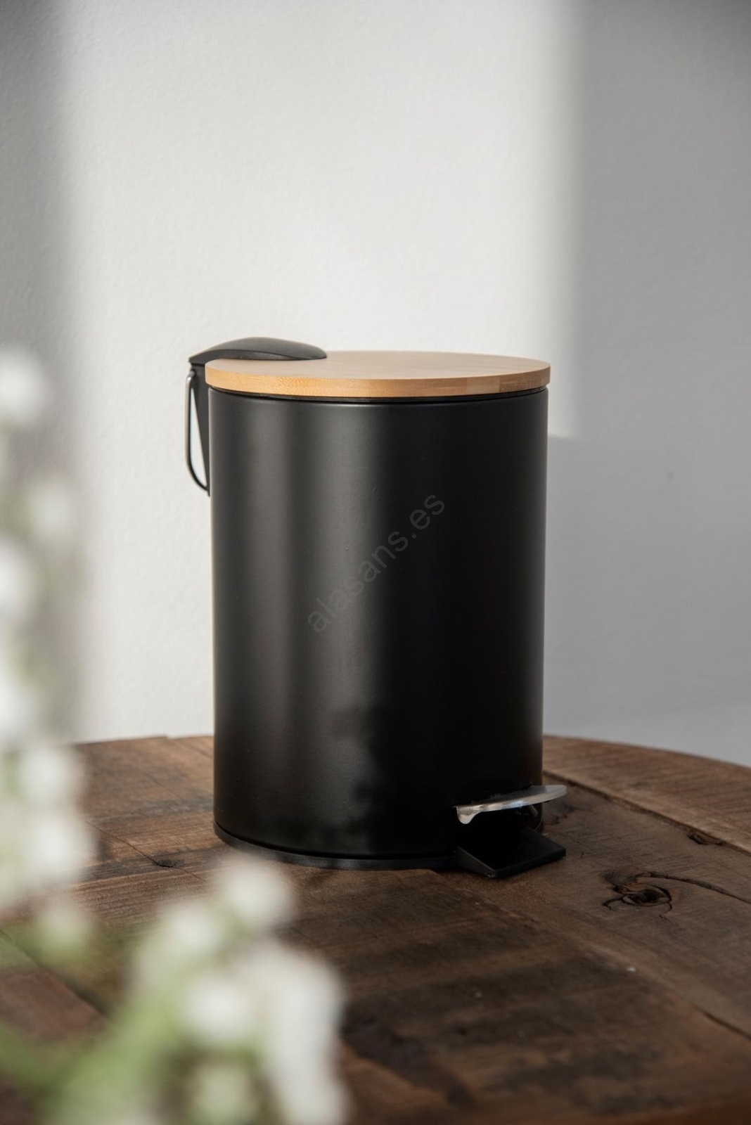 • Papelera elegante con acabado negro mate y tapa de bambú.