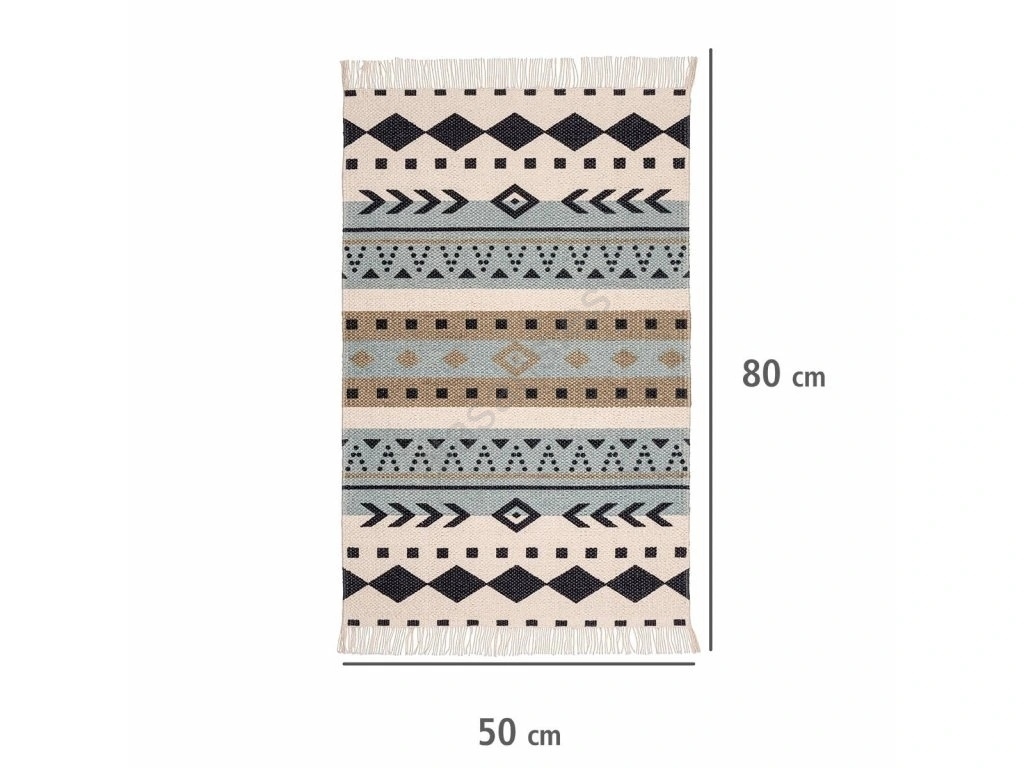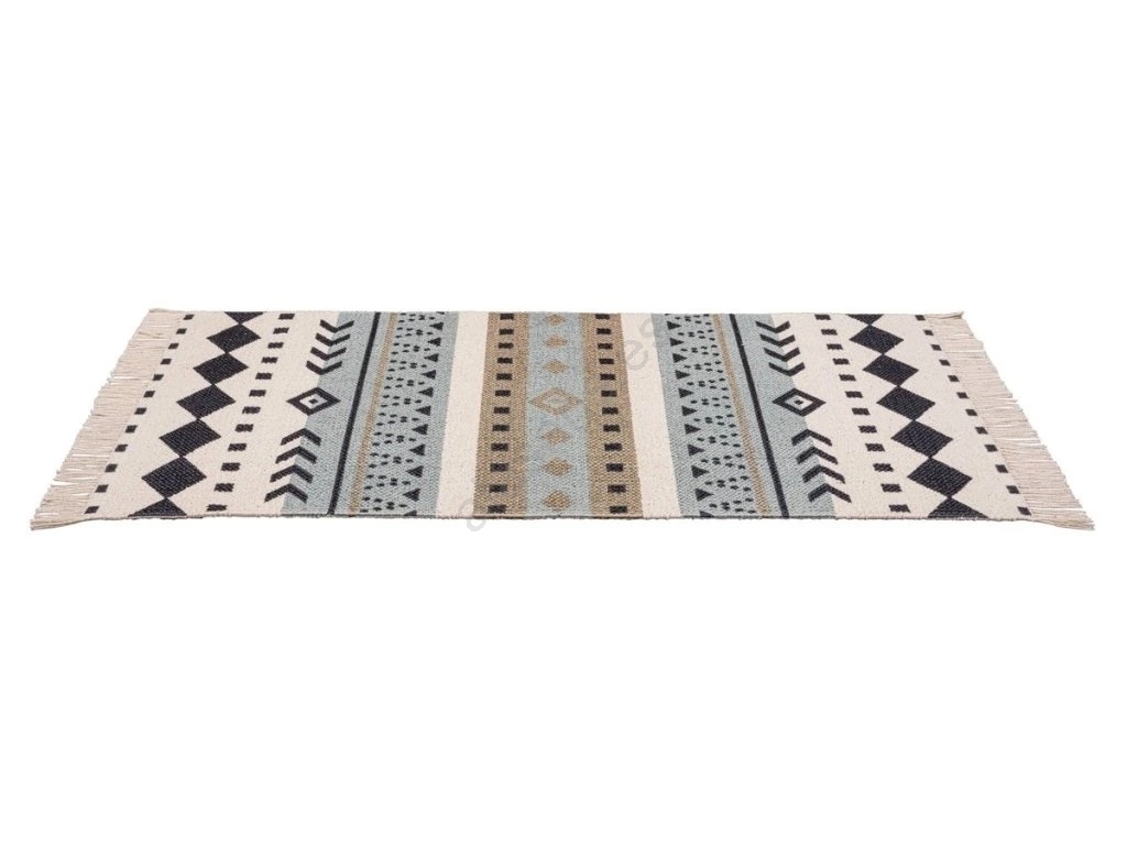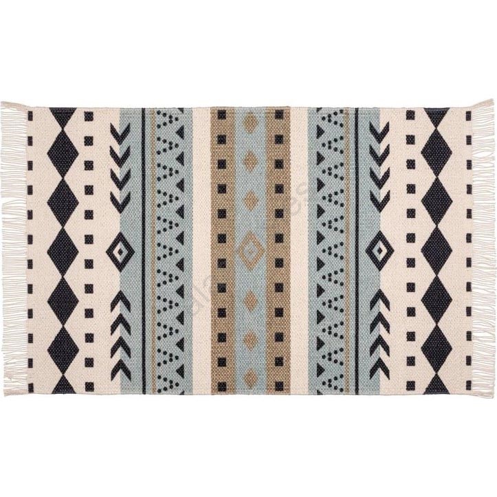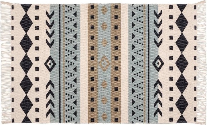 • Diseño étnico y elegante con motivos geométricos en azul, beige y negro.