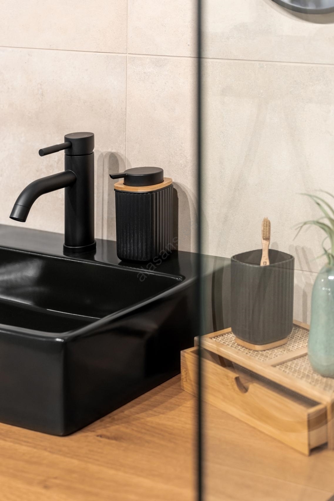• Combinación de plástico negro y detalle de bambú natural en la tapa.