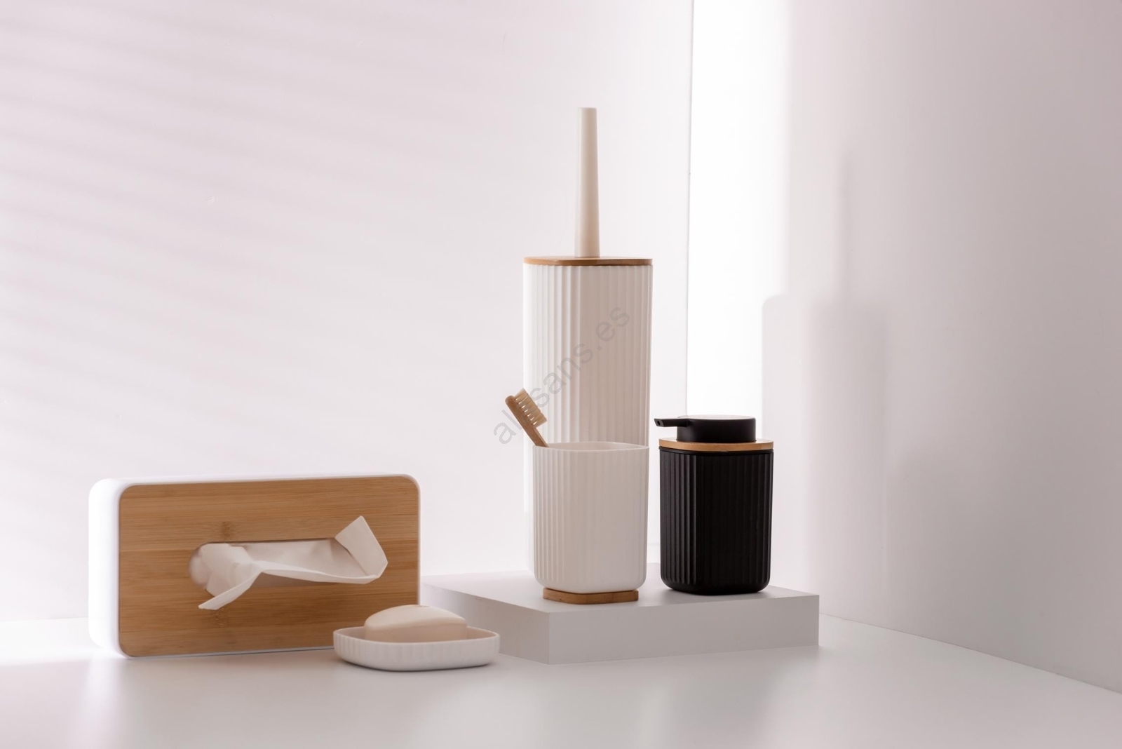 • La combinación de blanco y la tapa de bambú natural aporta un aspecto moderno y atemporal.