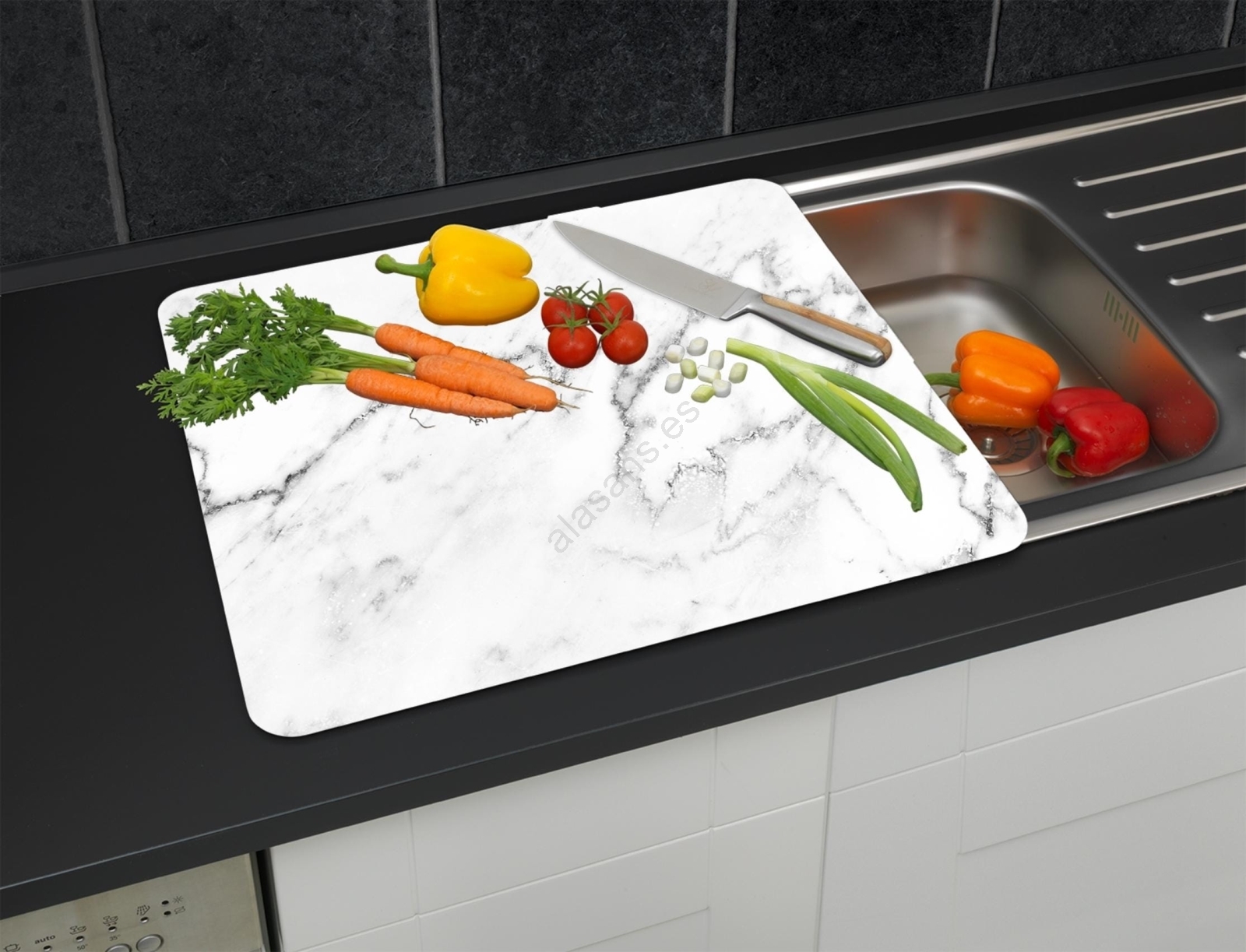 • Apta como cubierta para placa vitrocerámica y también como tabla de cortar extragrande.