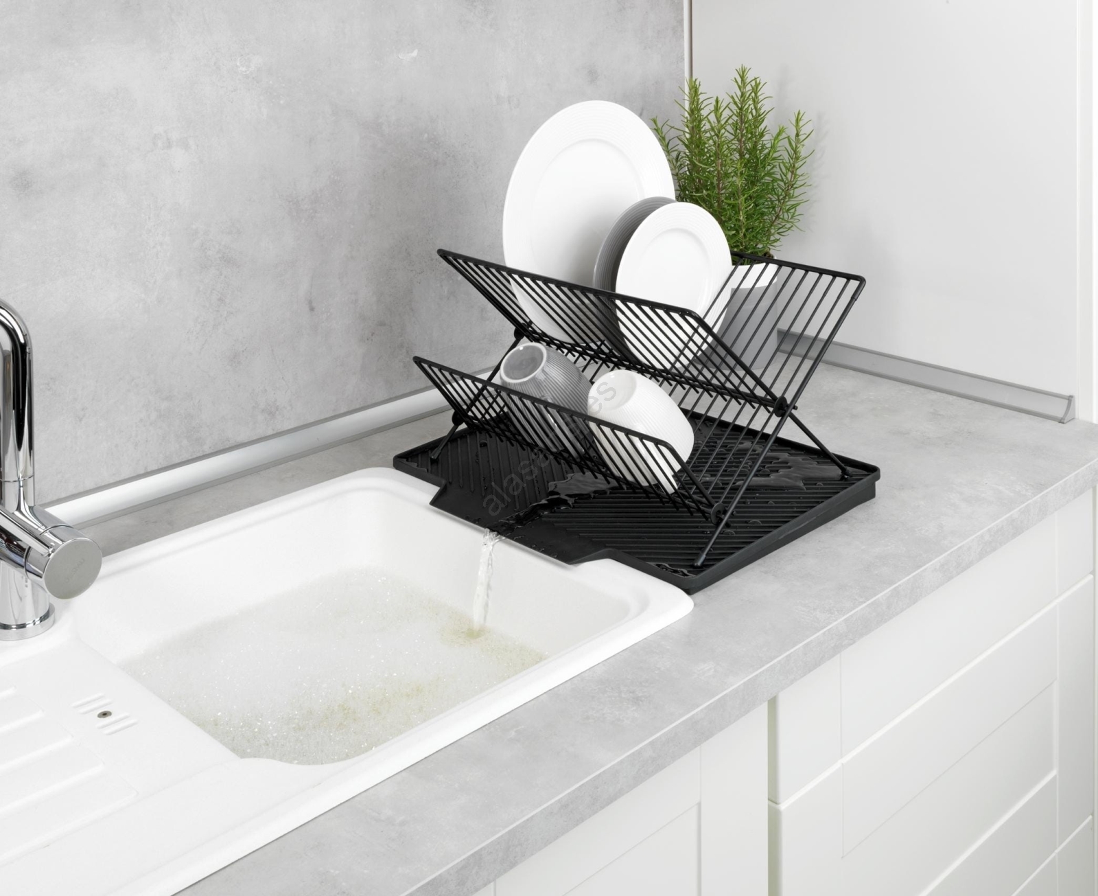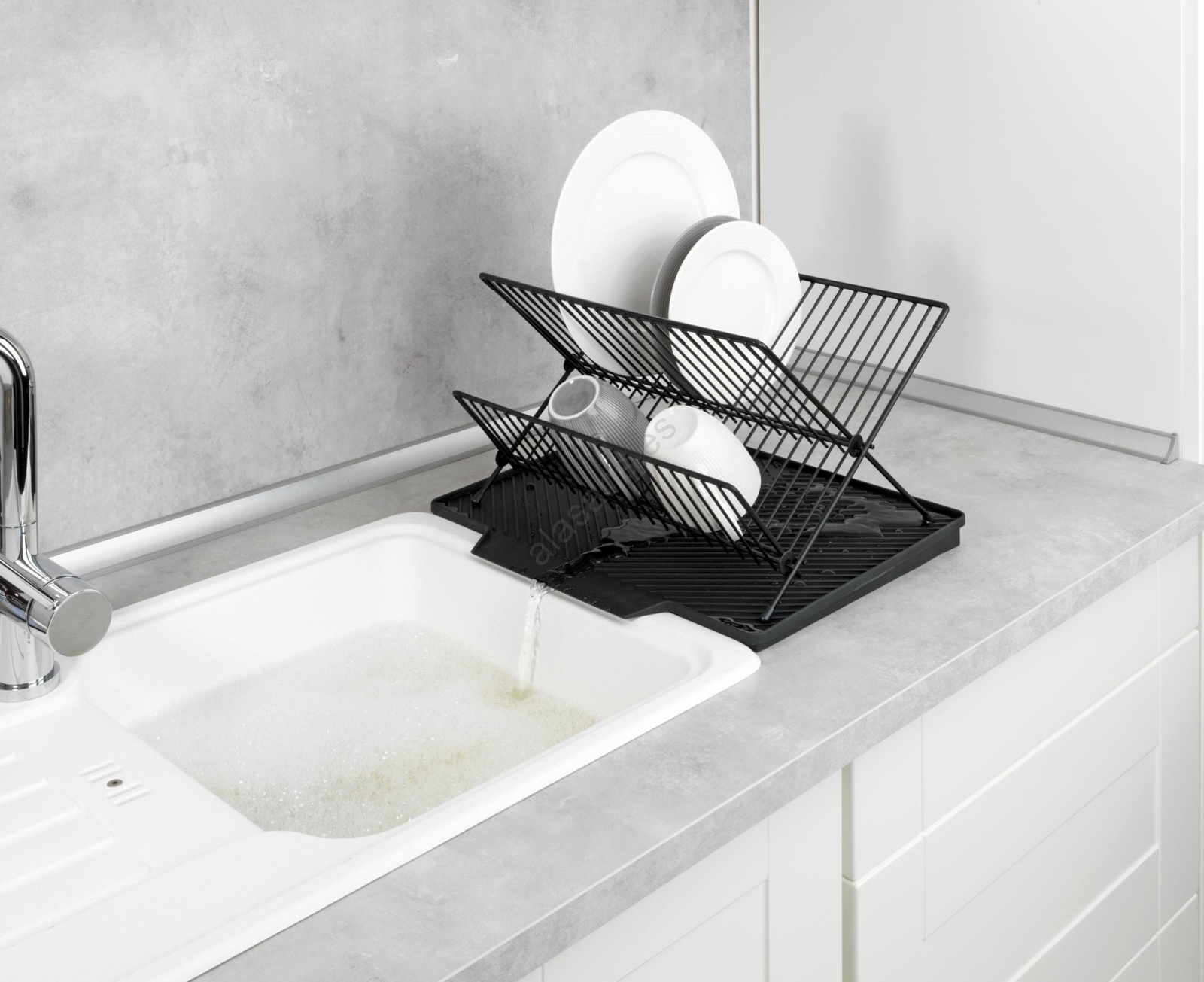 • Práctica bandeja escurridora con escurridor para platos para colocar junto al fregadero.